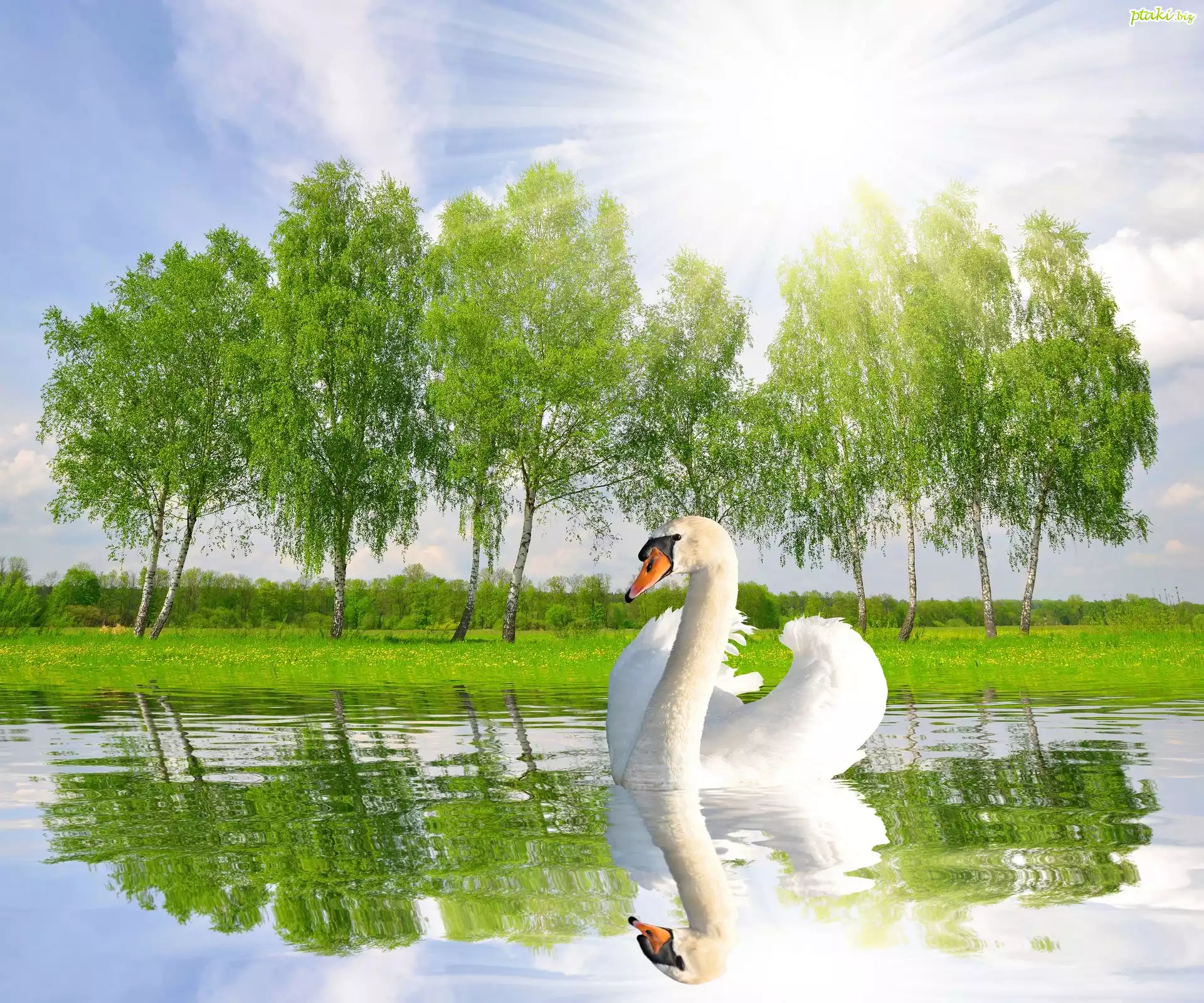 Łabędz, Drzewa, Promienie Słońca, Woda, Odbicie