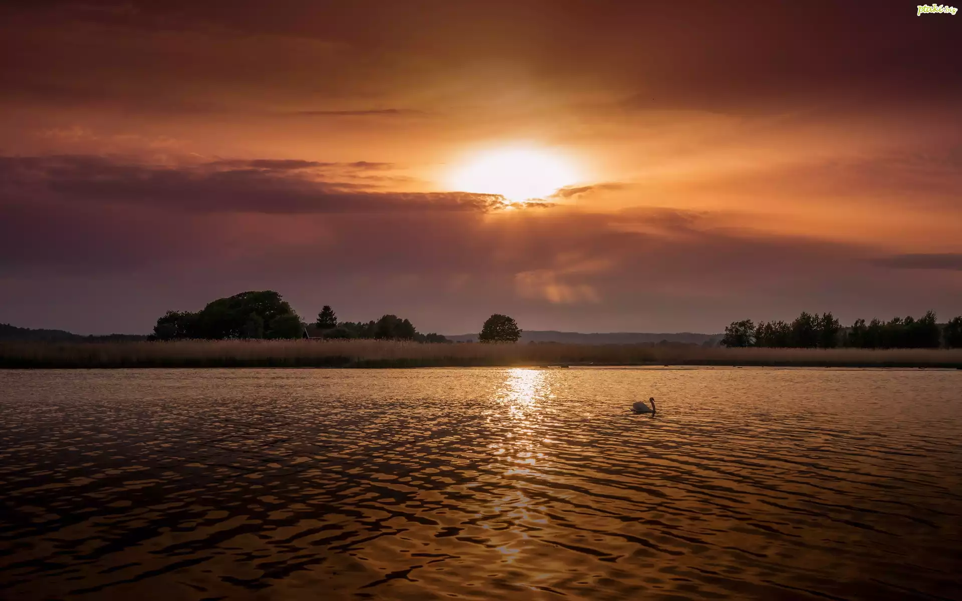 Jezioro, Łabędź, Łąki, Drzewa, Góry, Chmury, Promienie, Słońca