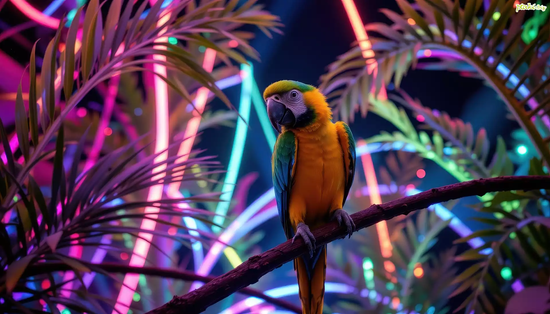 Papuga, Ara, Gałąź, Liście, Neonowe, Światło, Grafika AI
