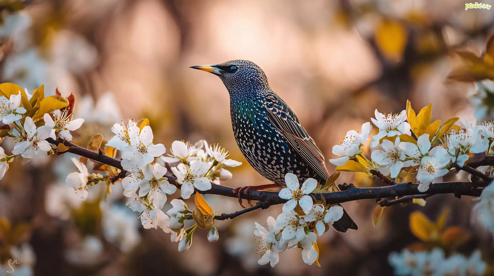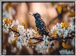 Ptak, Szpak, Gałązka, Kwiaty, Drzewo owocowe, Grafika AI