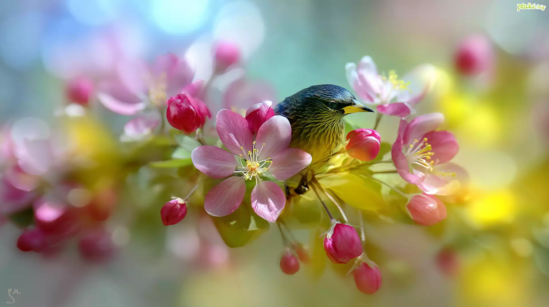 Ptak, Różowe, Kwiaty, Drzewo owocowe, Jabłoń, Grafika AI