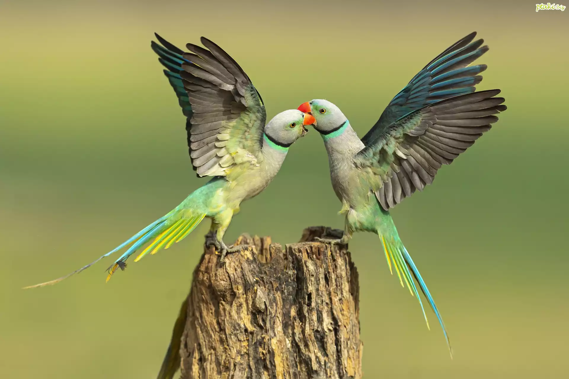 Ptaki, Dwie, Papugi, Aleksandretty seledynowe, Drzewo, Pniak