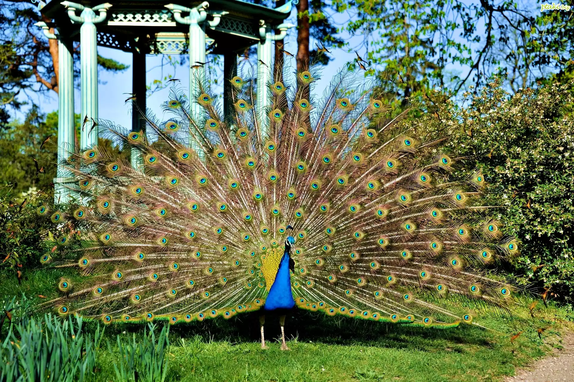 Pawi Ogon Niebieski, Paw, Pióra Paw, Ogon Biały, Paw, Drzewa Piękny, Biały, Paw Paw, Łąka, Ogród Bajecznie, Kolorowy, Paw Paw z rozłożonymi ogonem Pawie, Oczko, Krople Dwa, Pawie, Na, Gałęzi, Reprodukcja Paw, Ogon Głowa, Pawia Pawie, Pióro Paw, Trawa