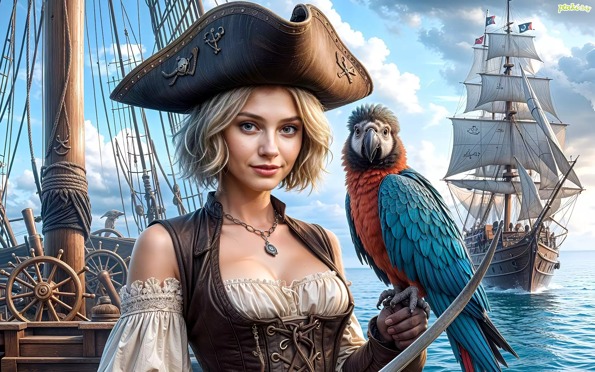 Kobieta, Pirat, Czapka, Morze, Żaglowce, Ptak, Papuga, Ara