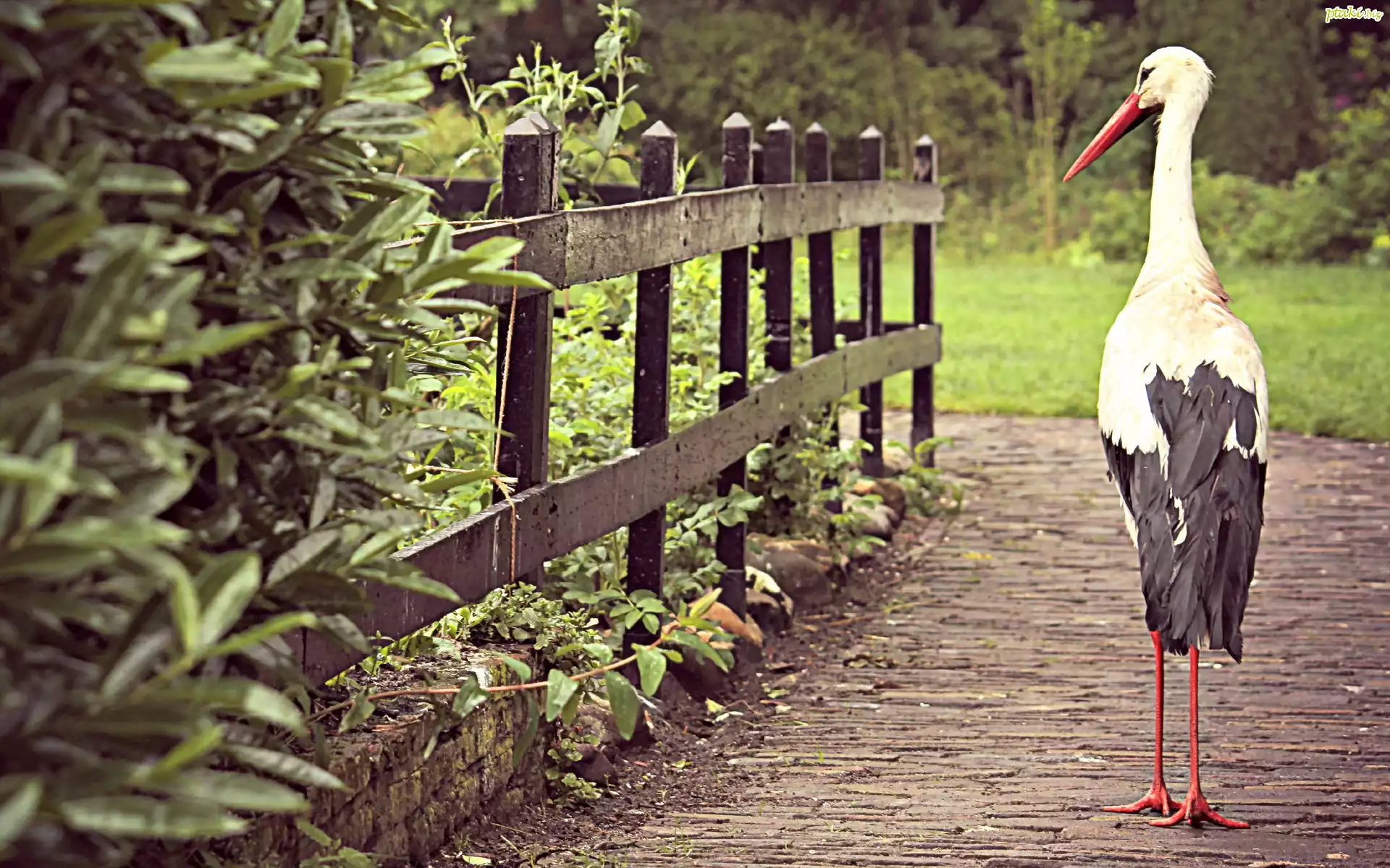 Bocian, Ogrodzenie, Chodnik, Rośliny