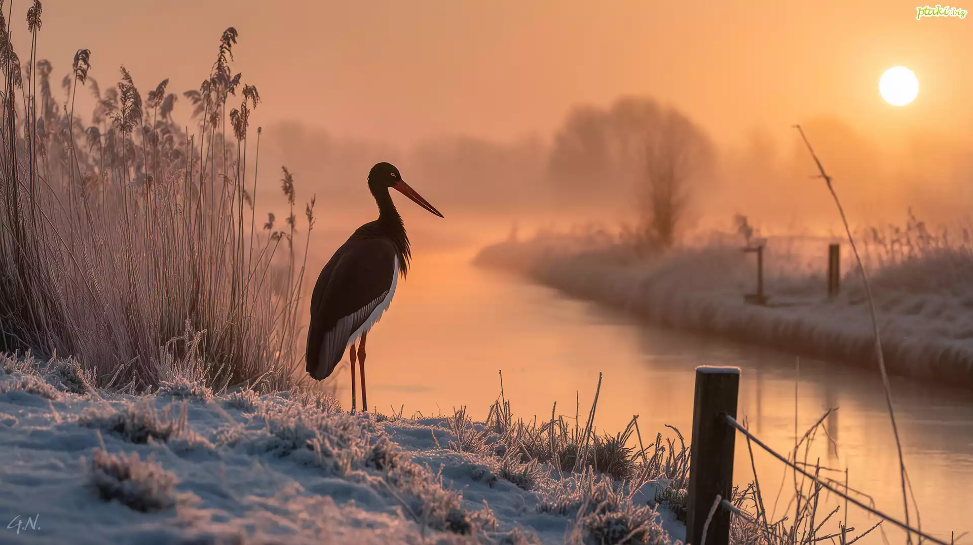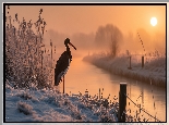 Bocian czarny, Rzeka, Oszronione, Trawy, Zima, Zachód słońca, Grafika Ai