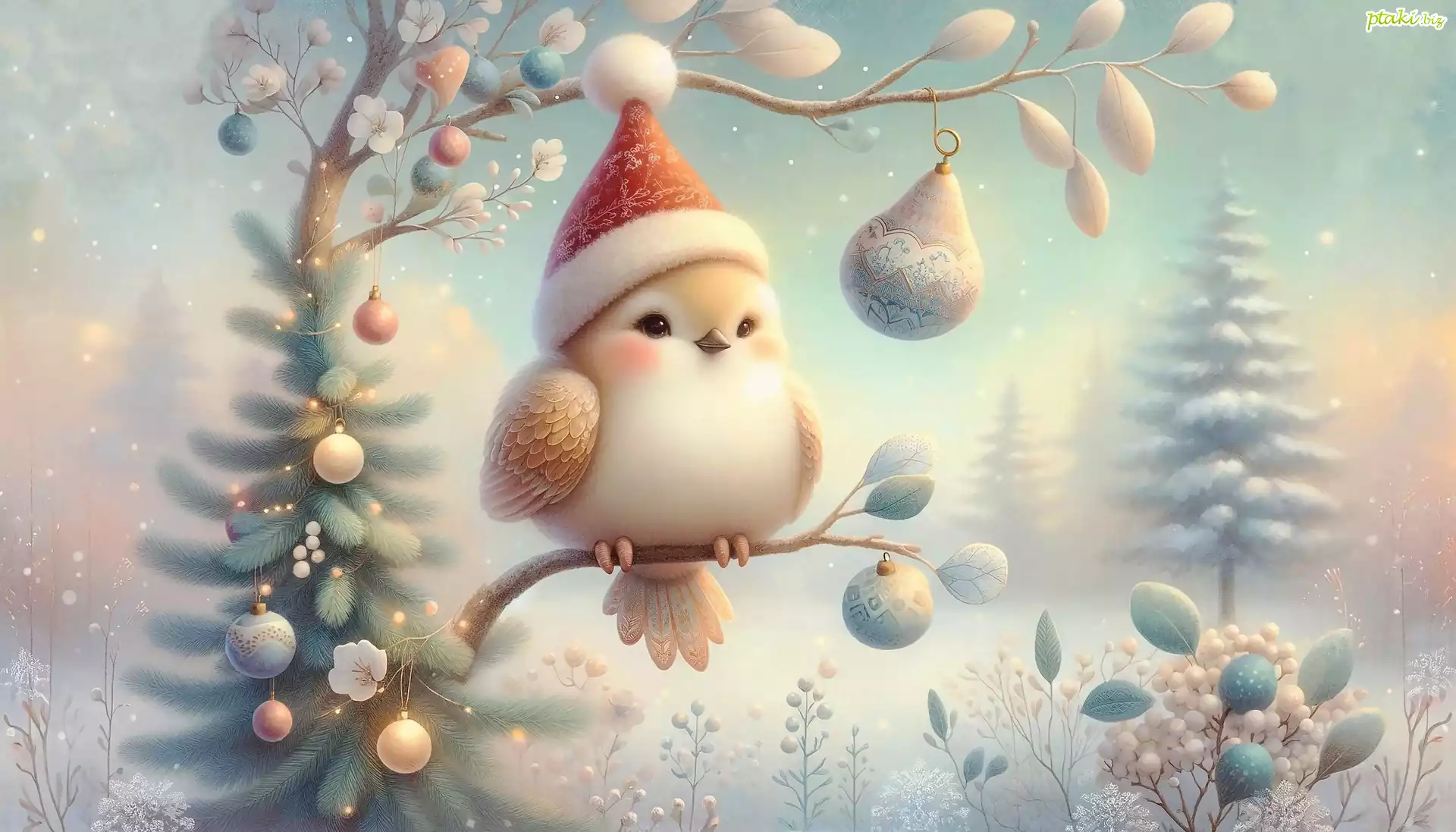 Zima, Świąteczne, Ptak, Bombki, Drzewo, Grafika