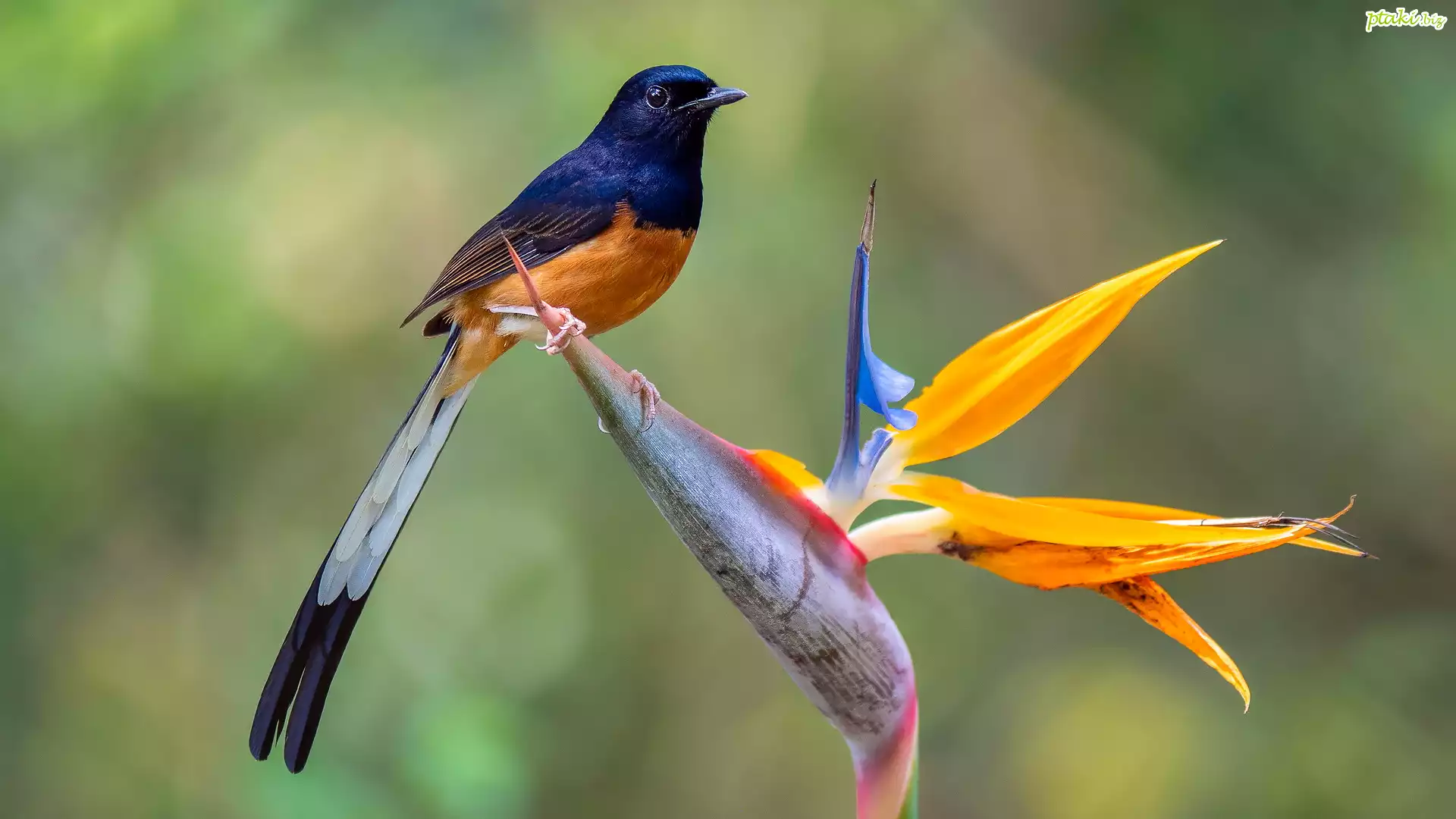 Brązowo-granatowy, Ptak, Sroczek białorzytny, Kwiat, Strelicja królewska