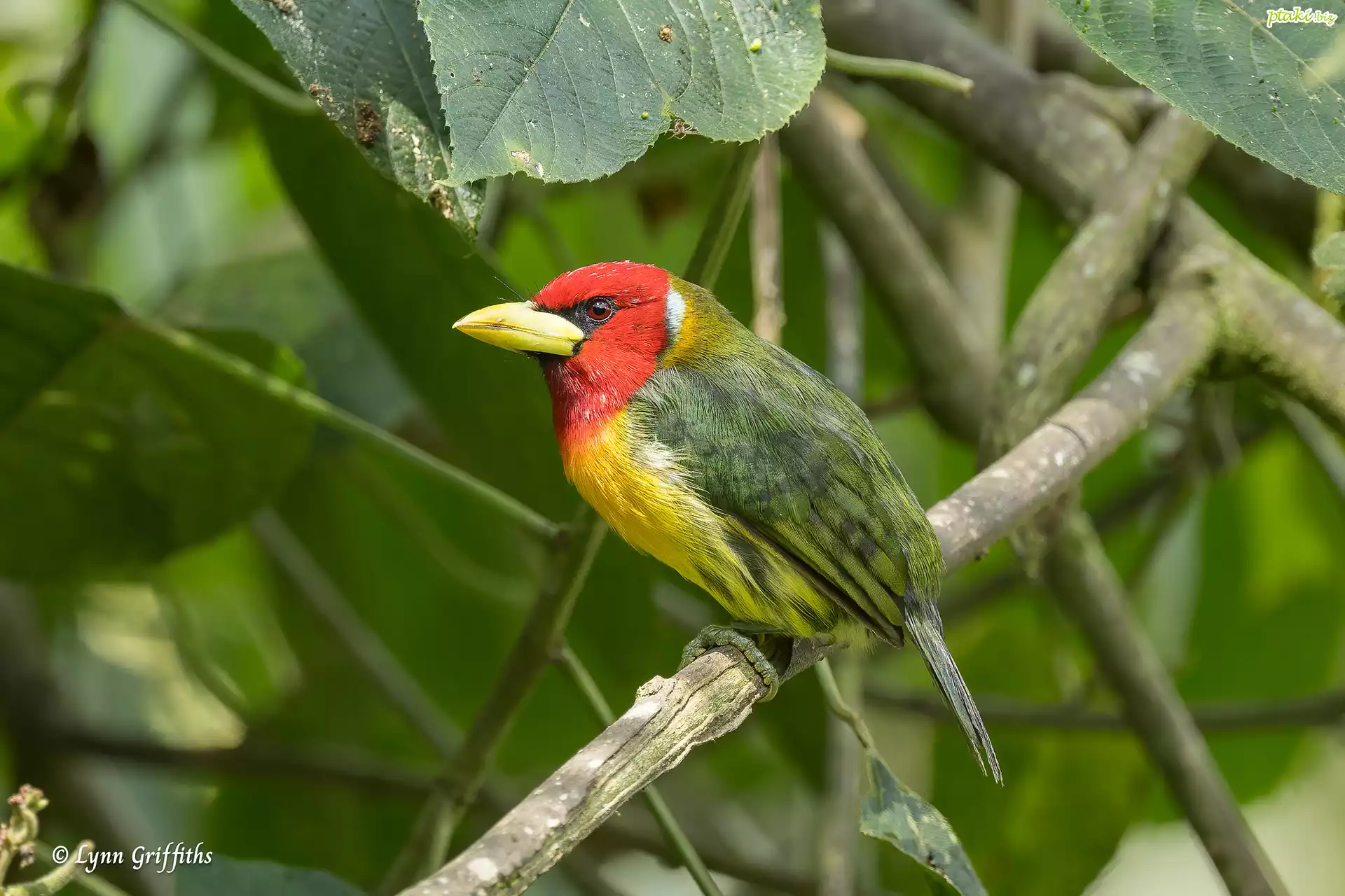 Ptak, Brodacz czerwonogłowy, Gałęzie, Liście