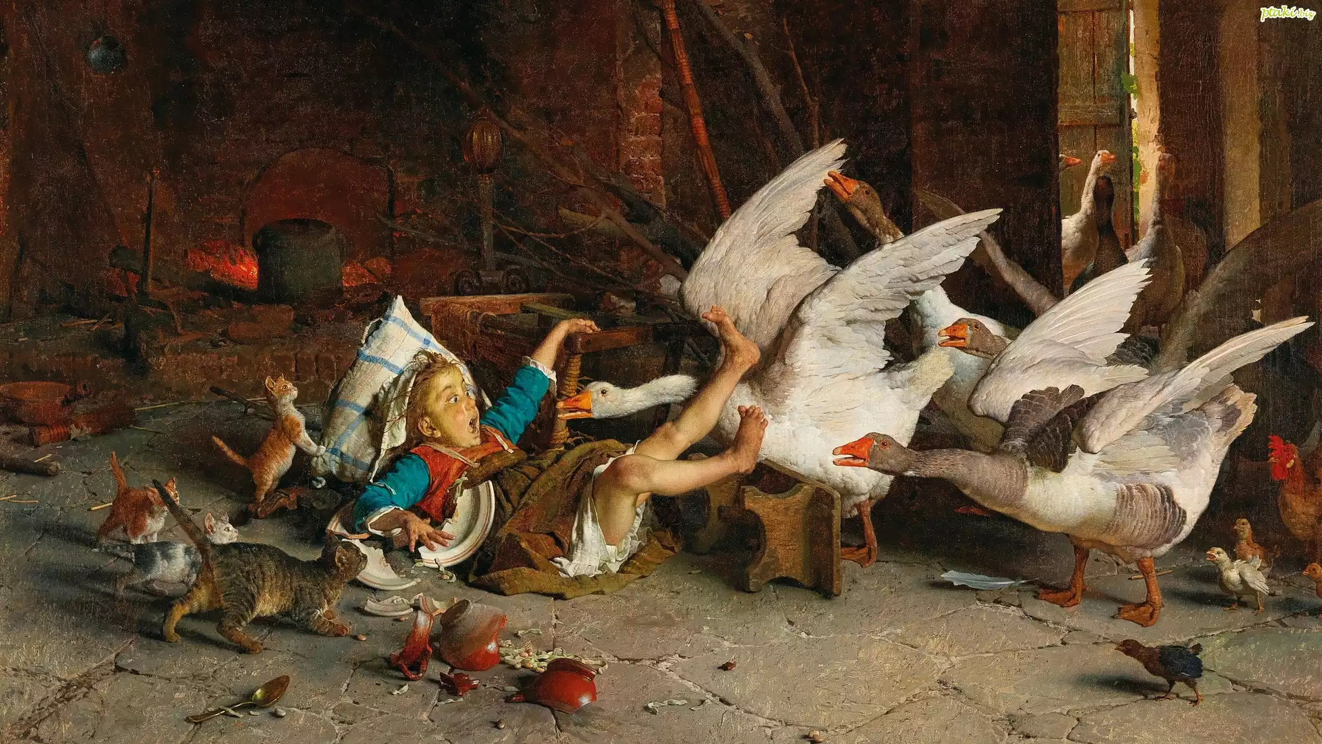 Przewrócona, Dziewczynka, Rozbity, Dzbanek, Gęsi, Kotki, Stodoła, Malarstwo, Gaetano Chierici
