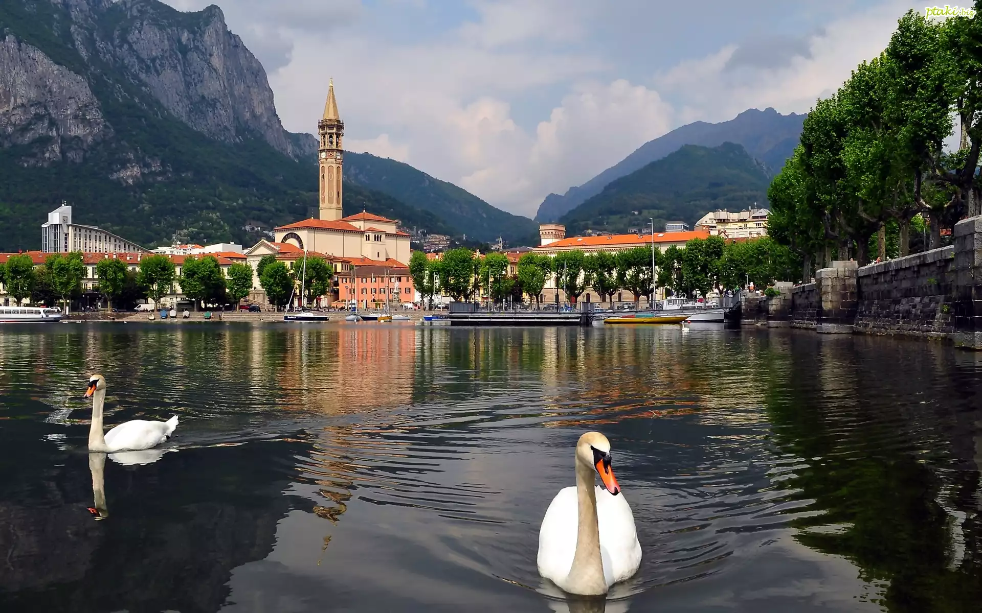 Jezioro Como, Włochy, Łabędzie, Miasteczko, Kościół, Góry