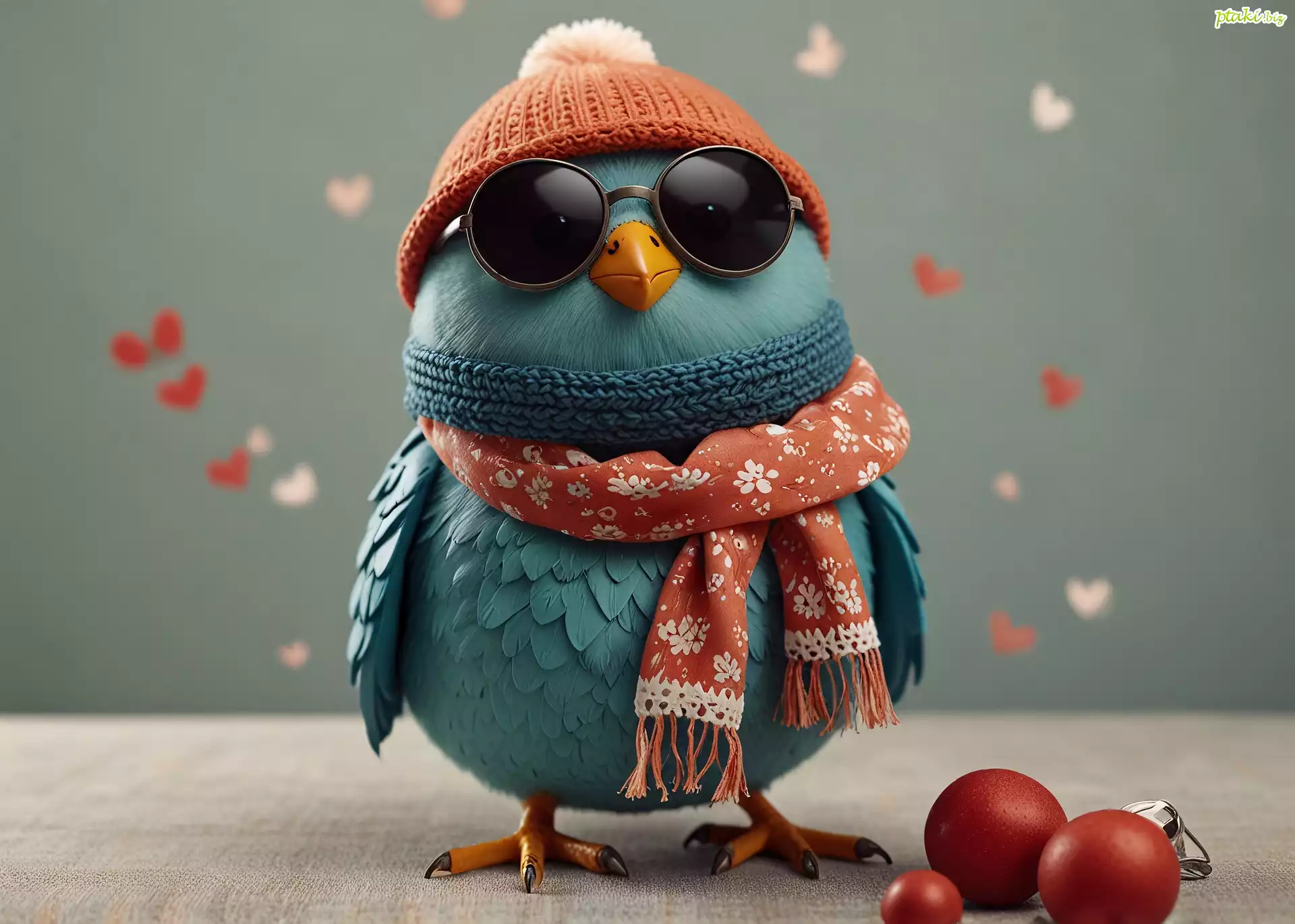 Śmieszne, Niebieski, Ptak, Czapka, Szalik, Okulary, Grafika