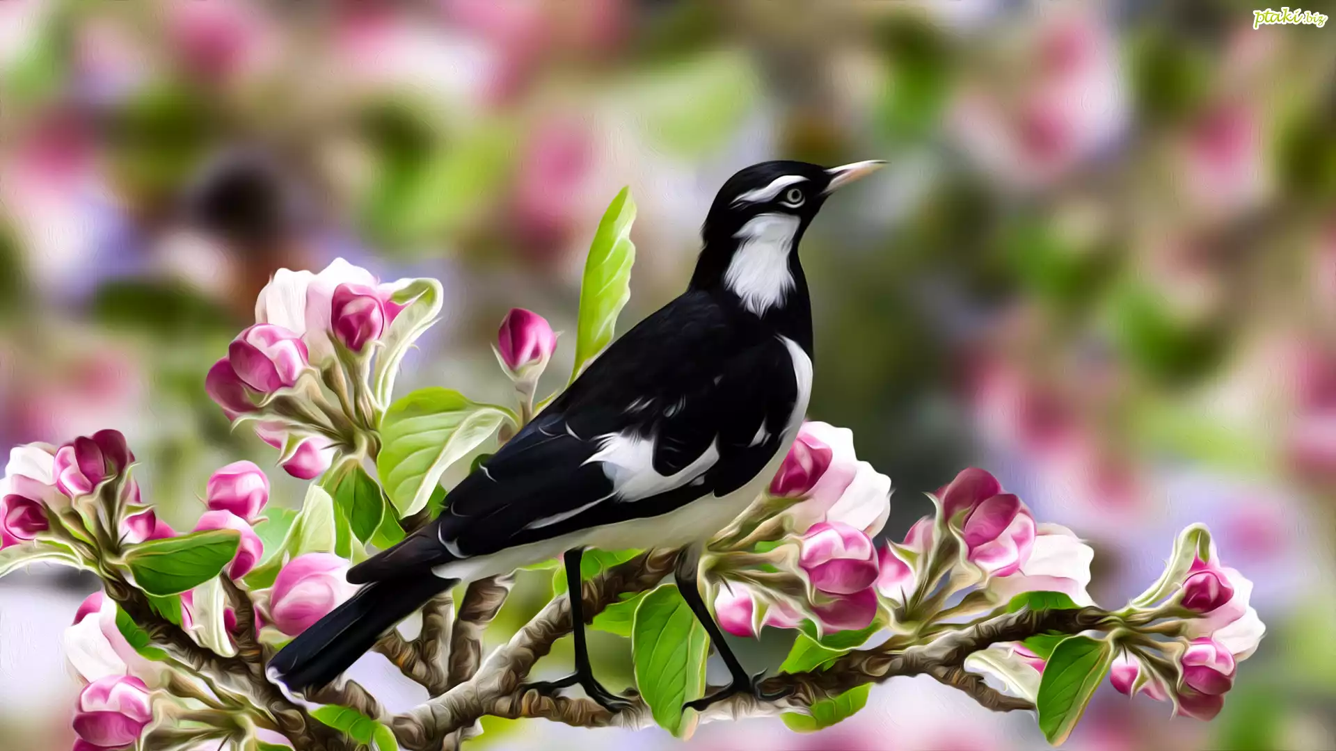 Czarno-biały, Ptak, Kwiaty, Gałązka, Grafika