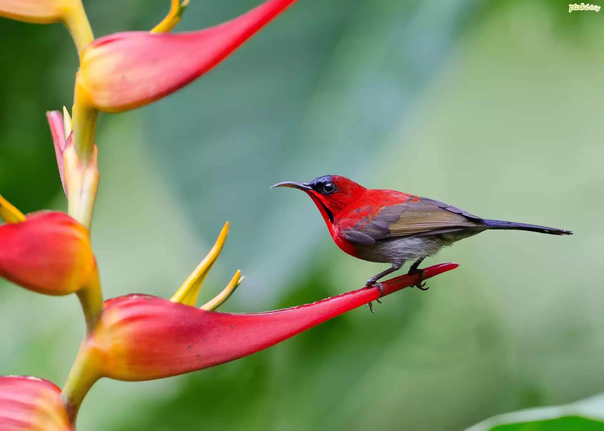 Czerwono, Szary, Ptaszek, Egzotyczny, Kwiat