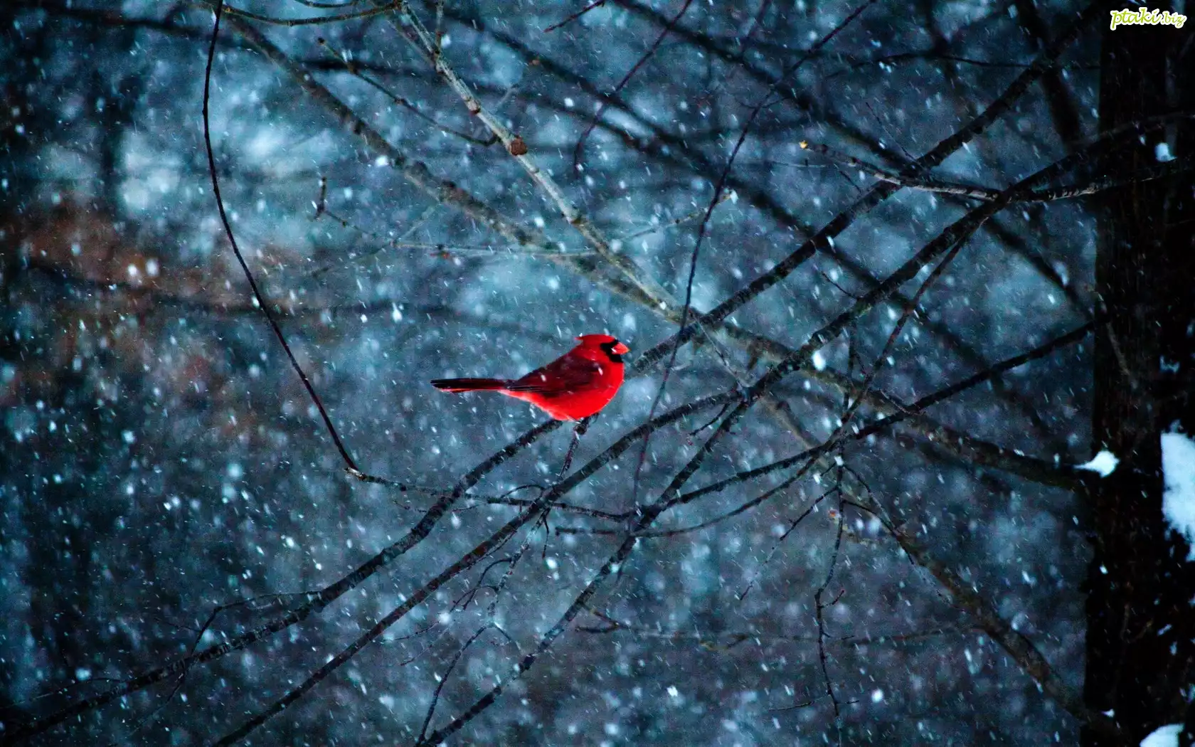 Czerwony, Ptaszek ,Gałęzie, Śnieg