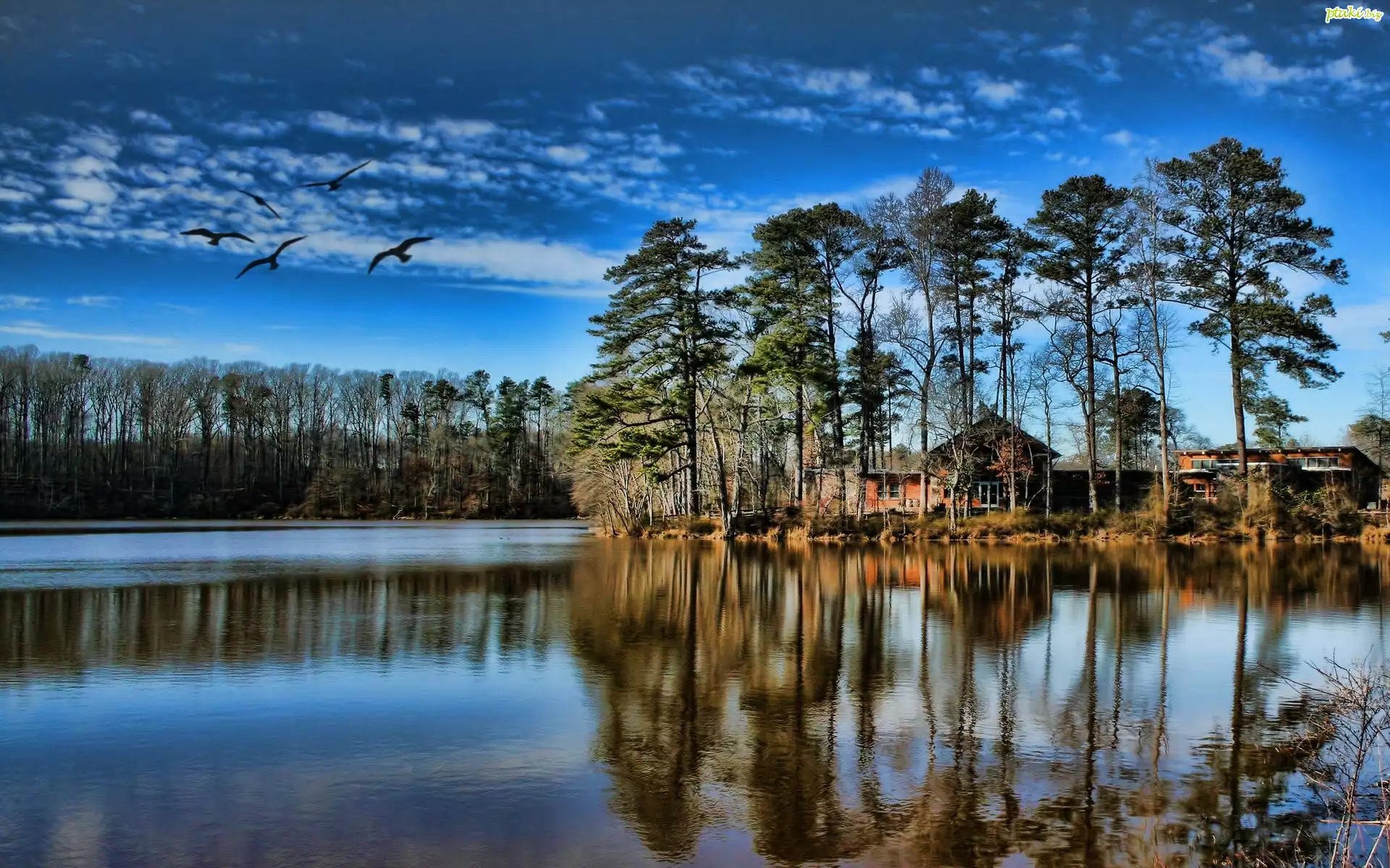 Jezioro, Drzewa, Ptaki