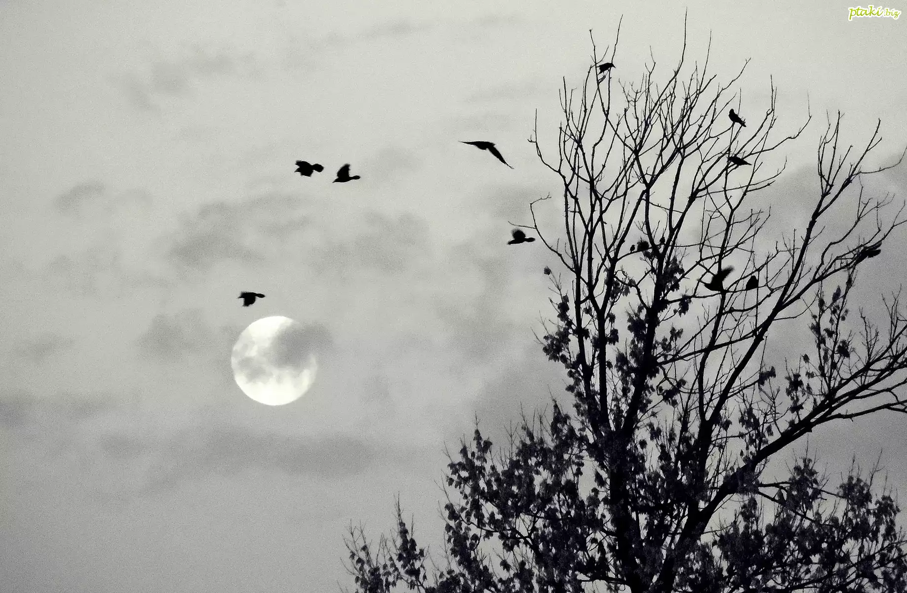 Księżyc, Drzewa, Ptaki