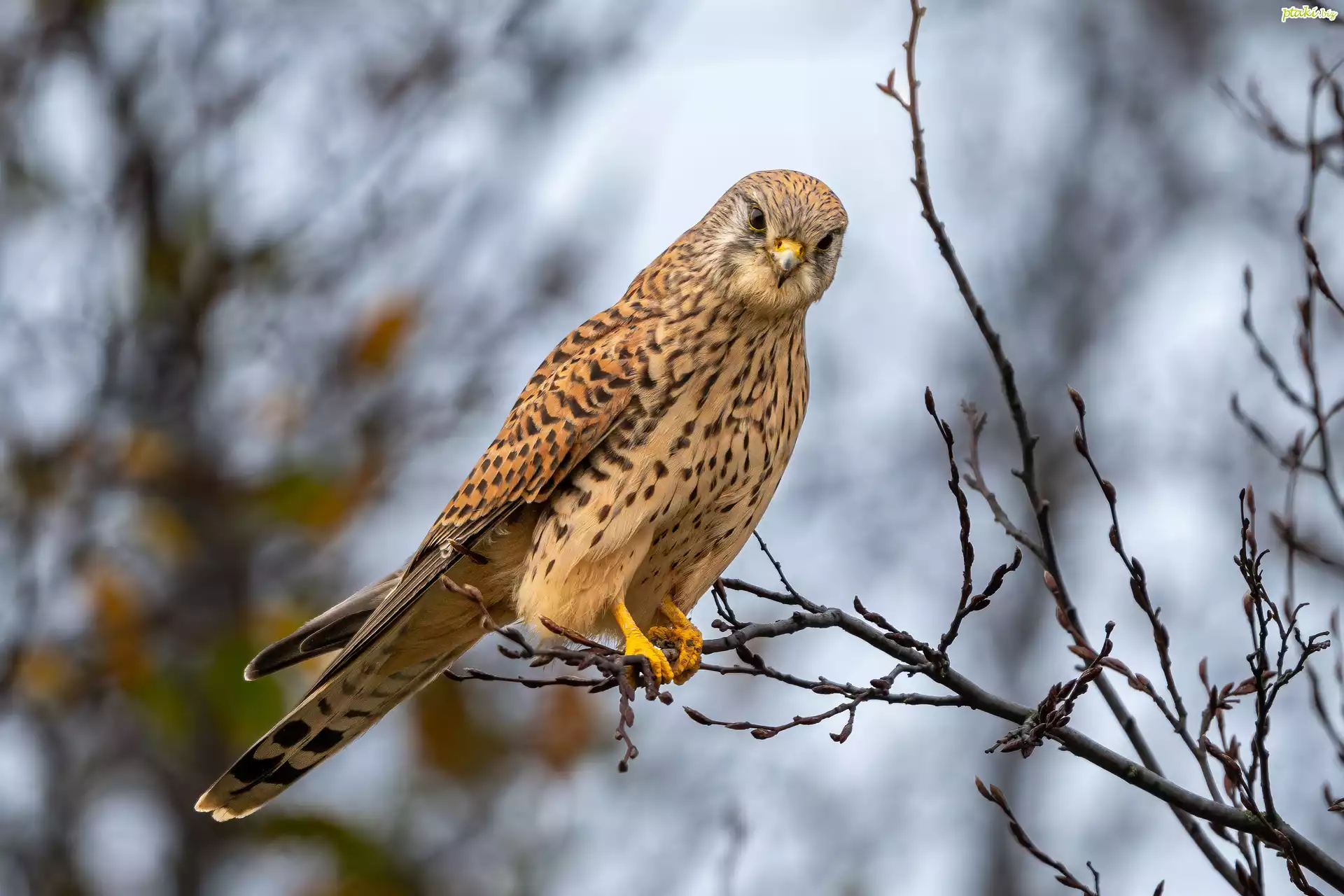 Ptak, Pustułka zwyczajna, Drzewa, Gałęzie, Zbliżenie, Rozmycie