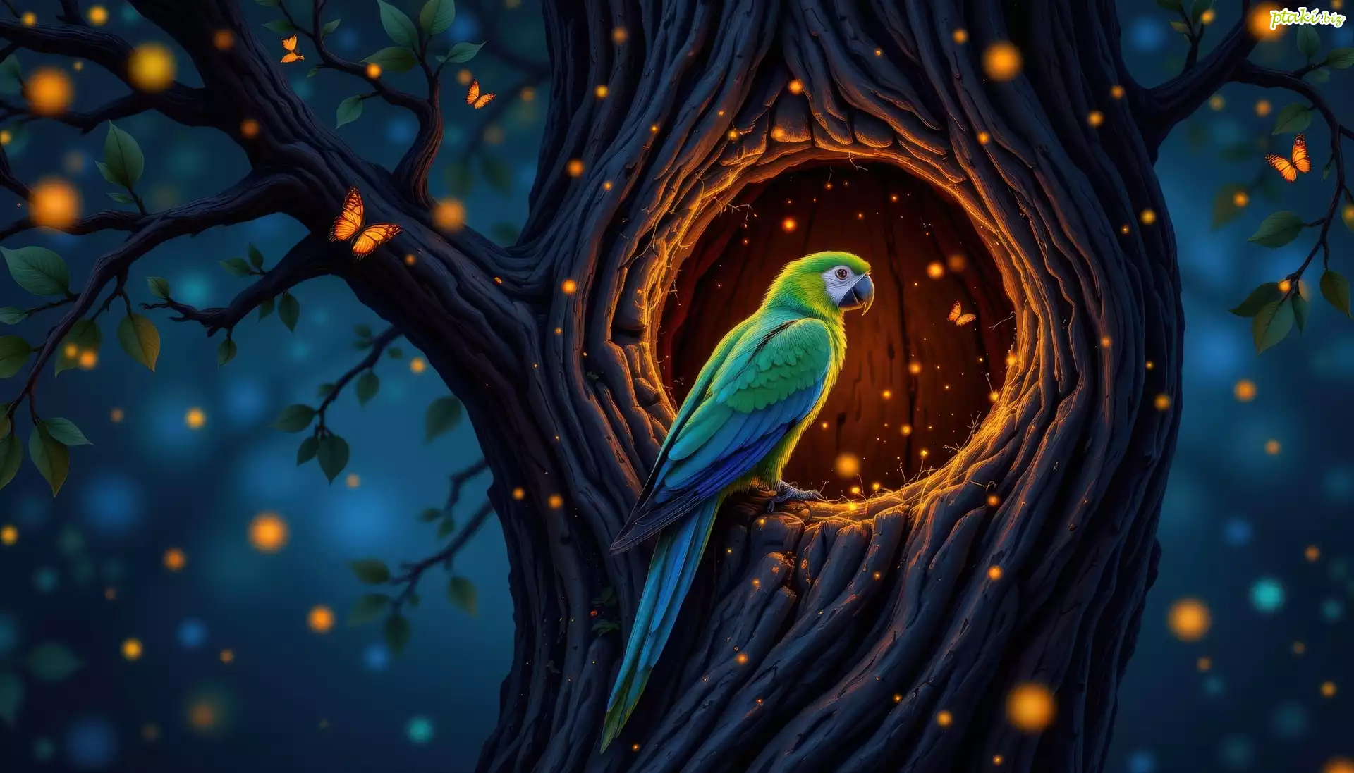 Papuga, Drzewo, Dziupla, Noc, AI