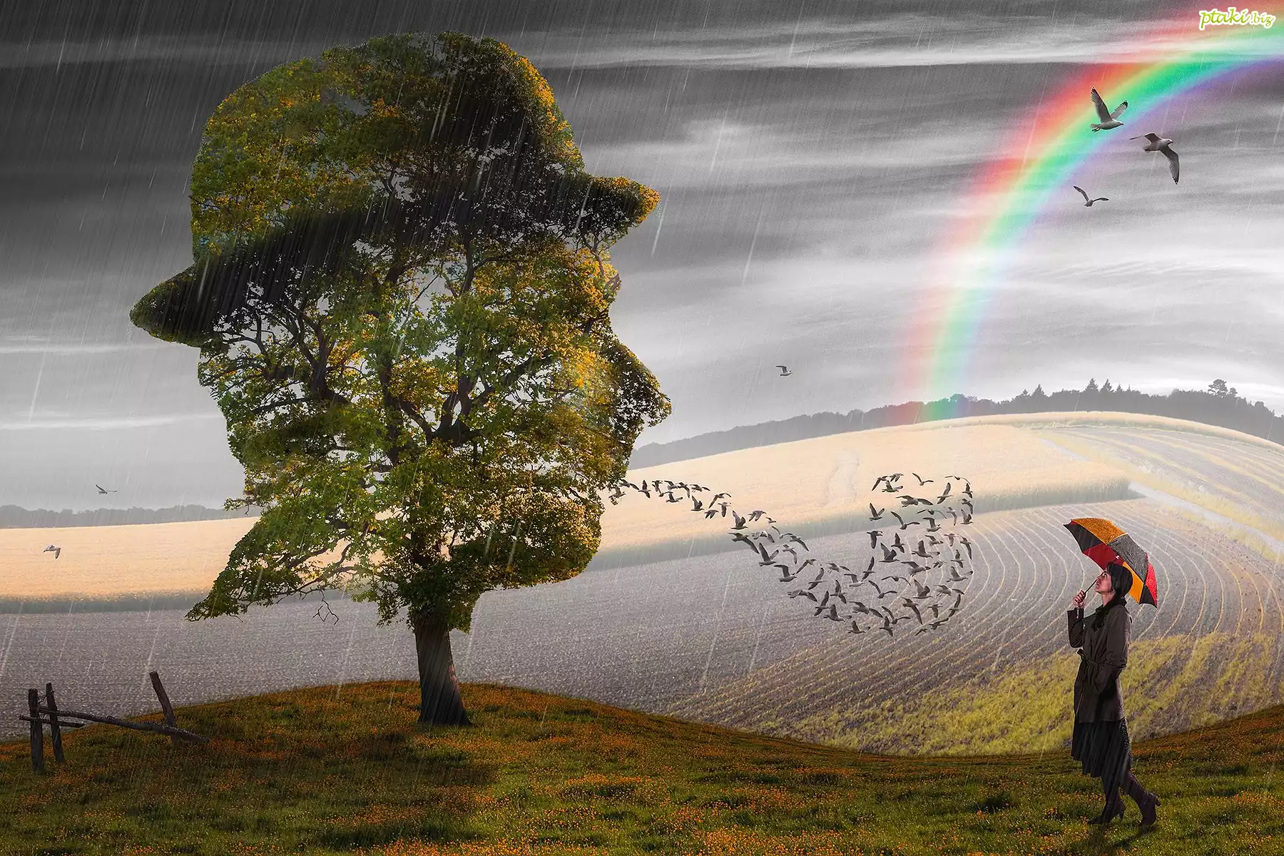Grafika, Drzewo, Ptaki, Tęcza, Dziewczyna, Deszcz, Parasolka