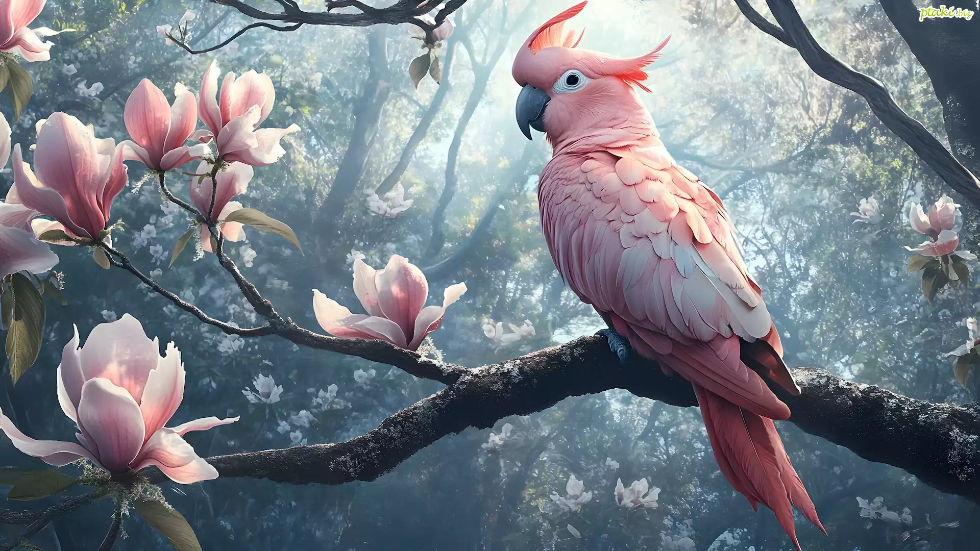 Ptak, Papuga, Kakadu, Drzewo, Magnolia, Kwiaty