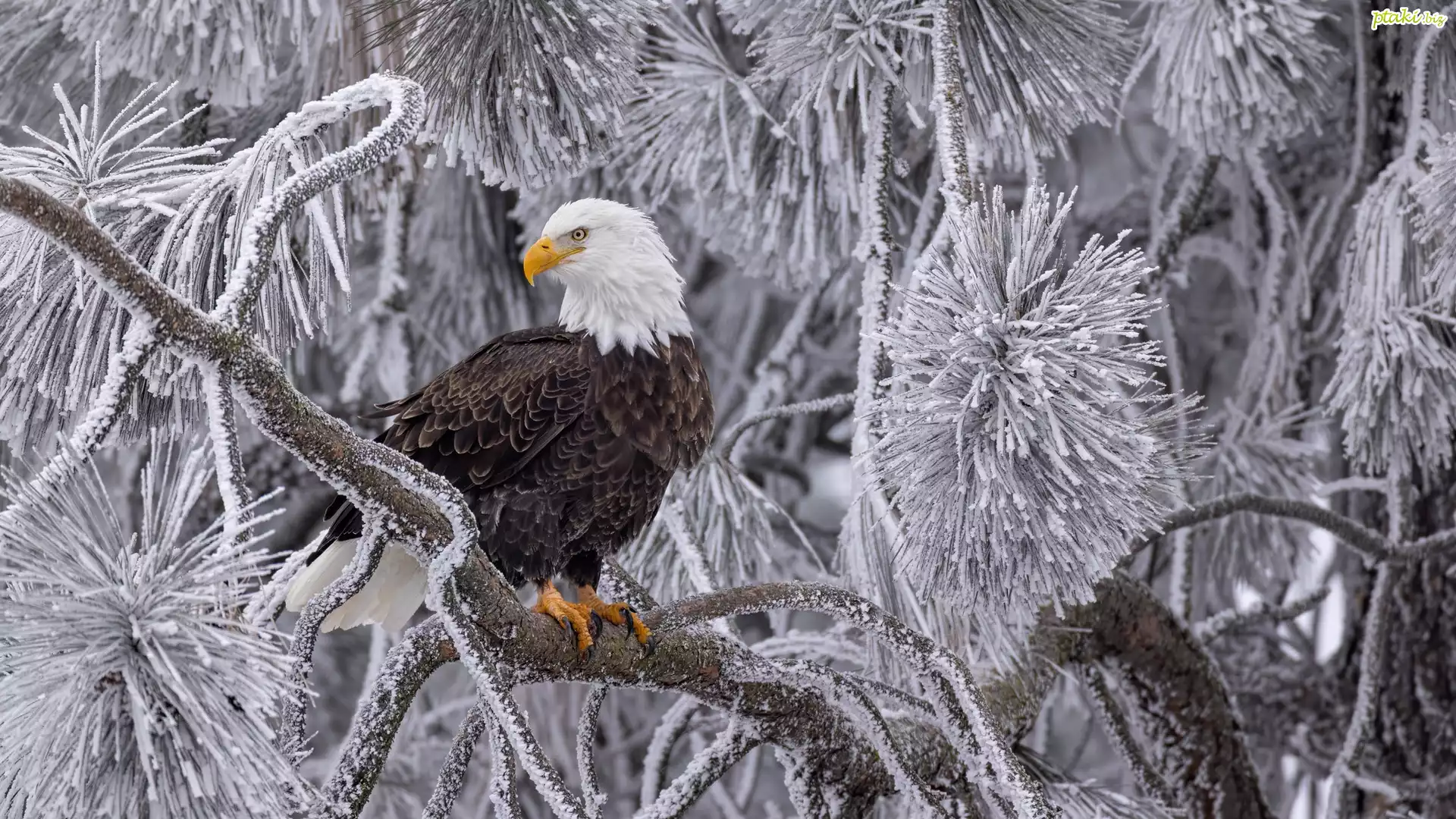 Bielik amerykański, Ptak, Drzewo, Gałęzie, Oszronione