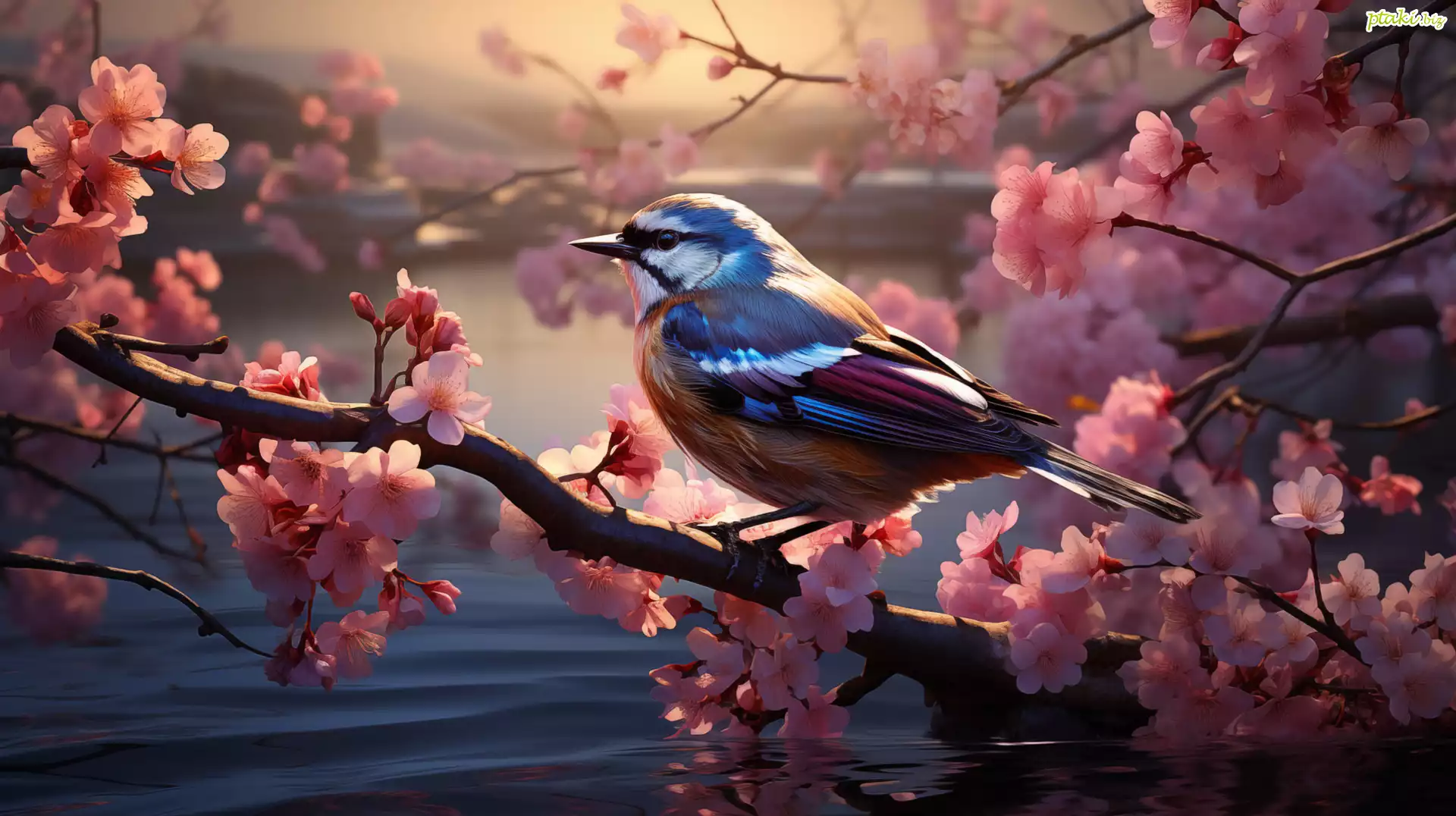 Ptak, Ukwiecone, Gałęzie, Drzewo owocowe, Woda