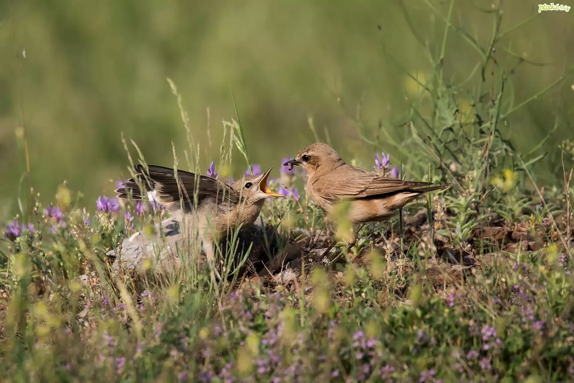 Dwa, Ptaki, Białorzytki płowe, Karmienie, Trawa