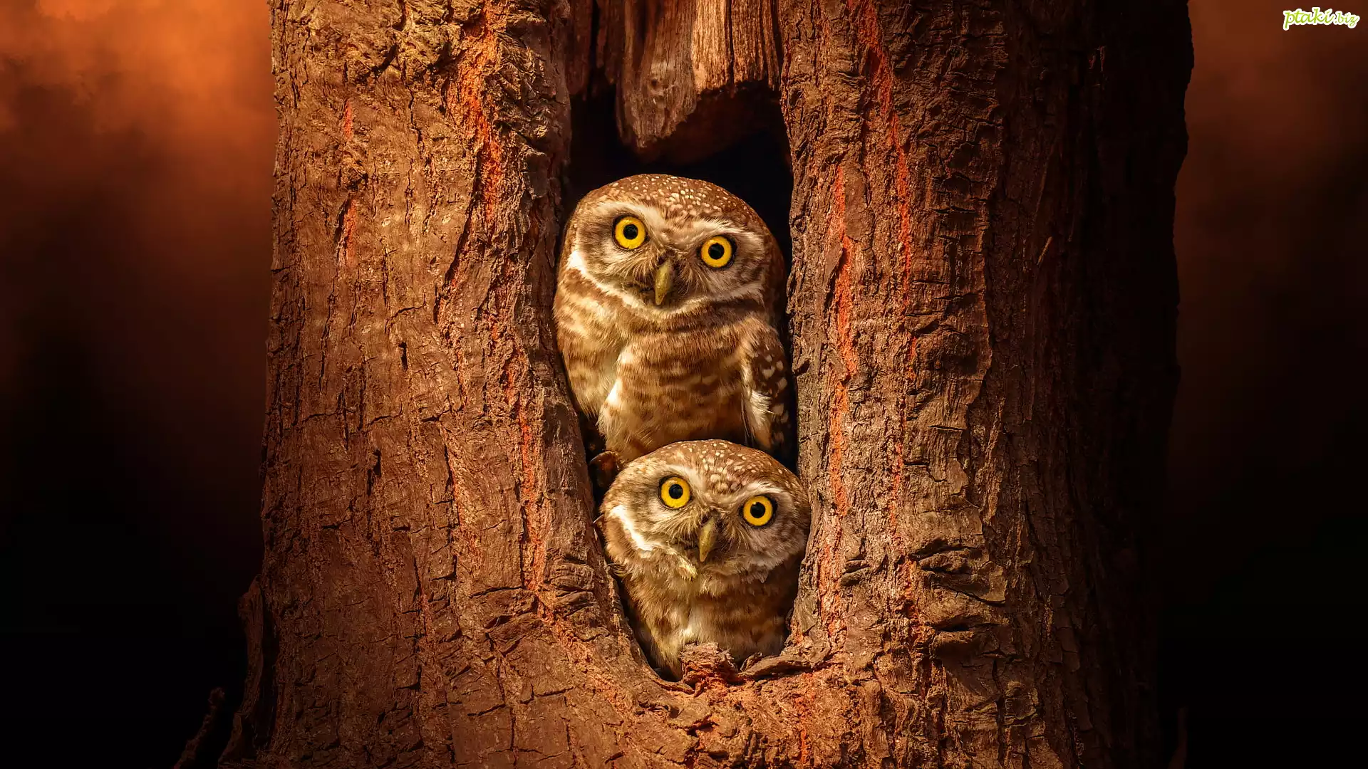 Dwie, Sowy, Pójdźki, Drzewo, Dziupla