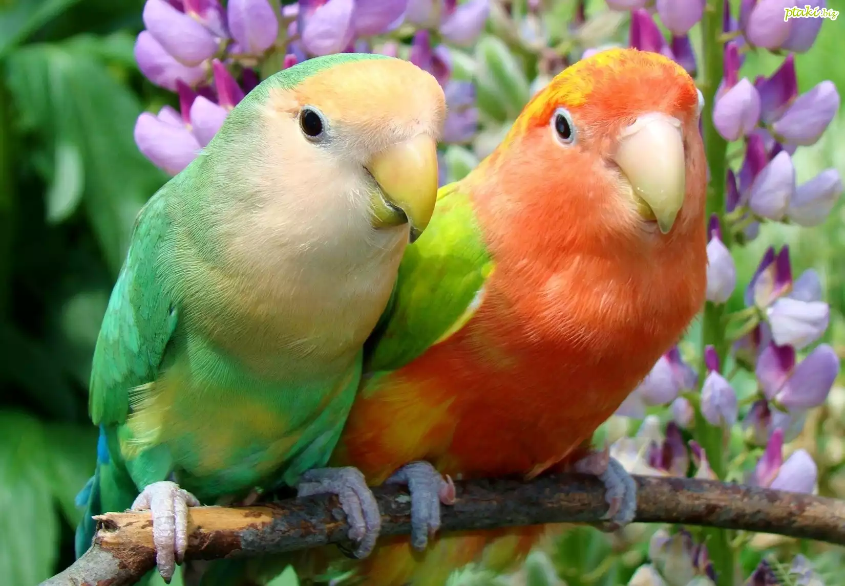 Dwie, Kolorowe, Papużki, Kwiaty