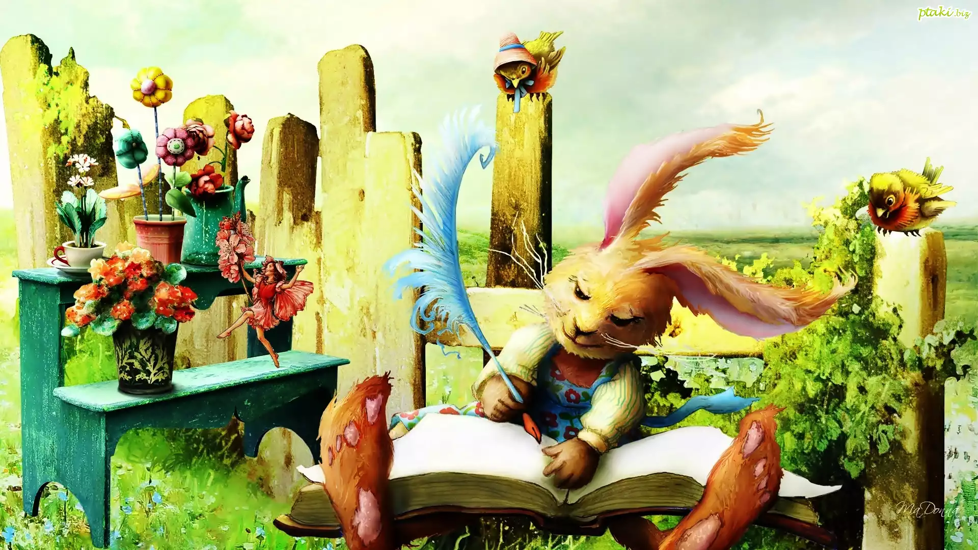 Bajecznie, Zając, Pióro, Ptaszki, Motylek, Kwiaty, Płot, Dla dzieci