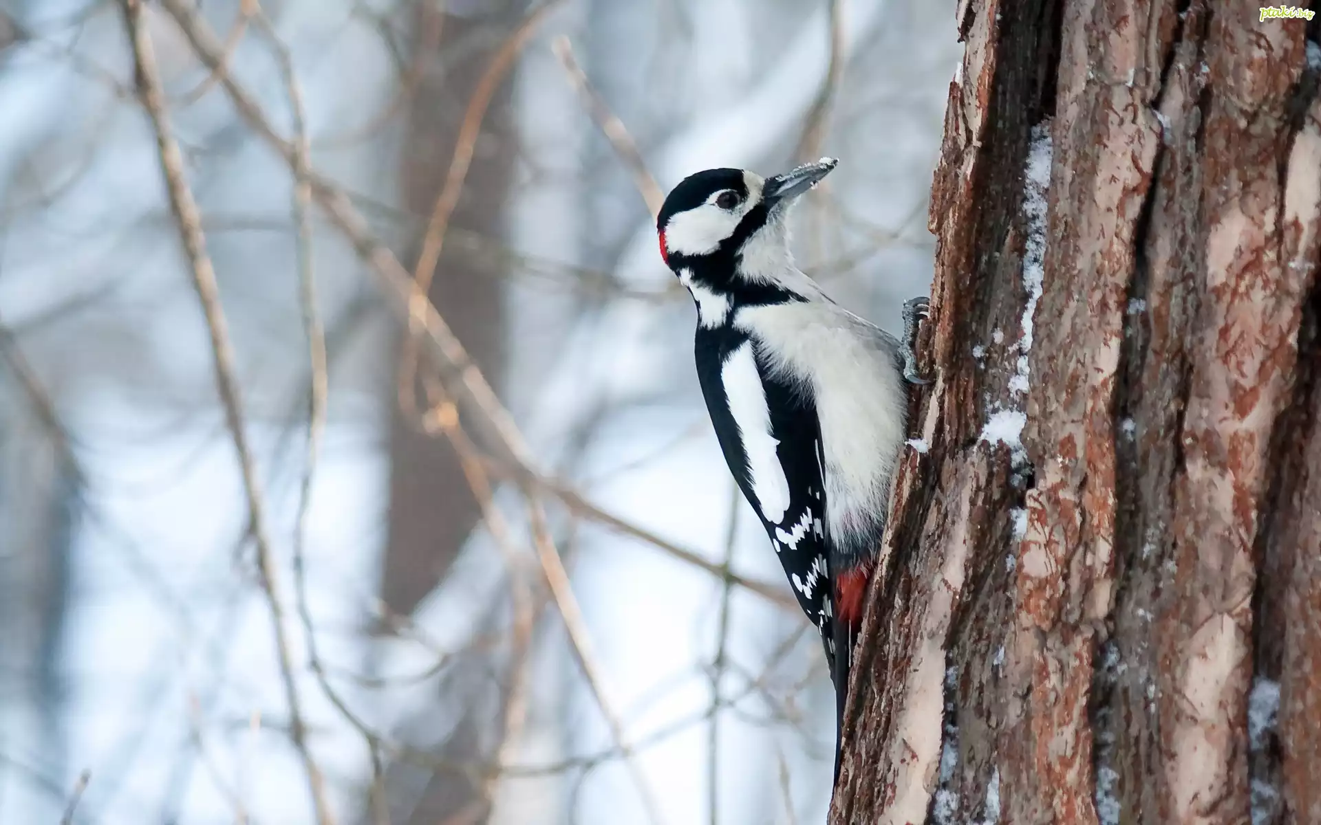 Dzięcioł, Drzewo, Las, Zima