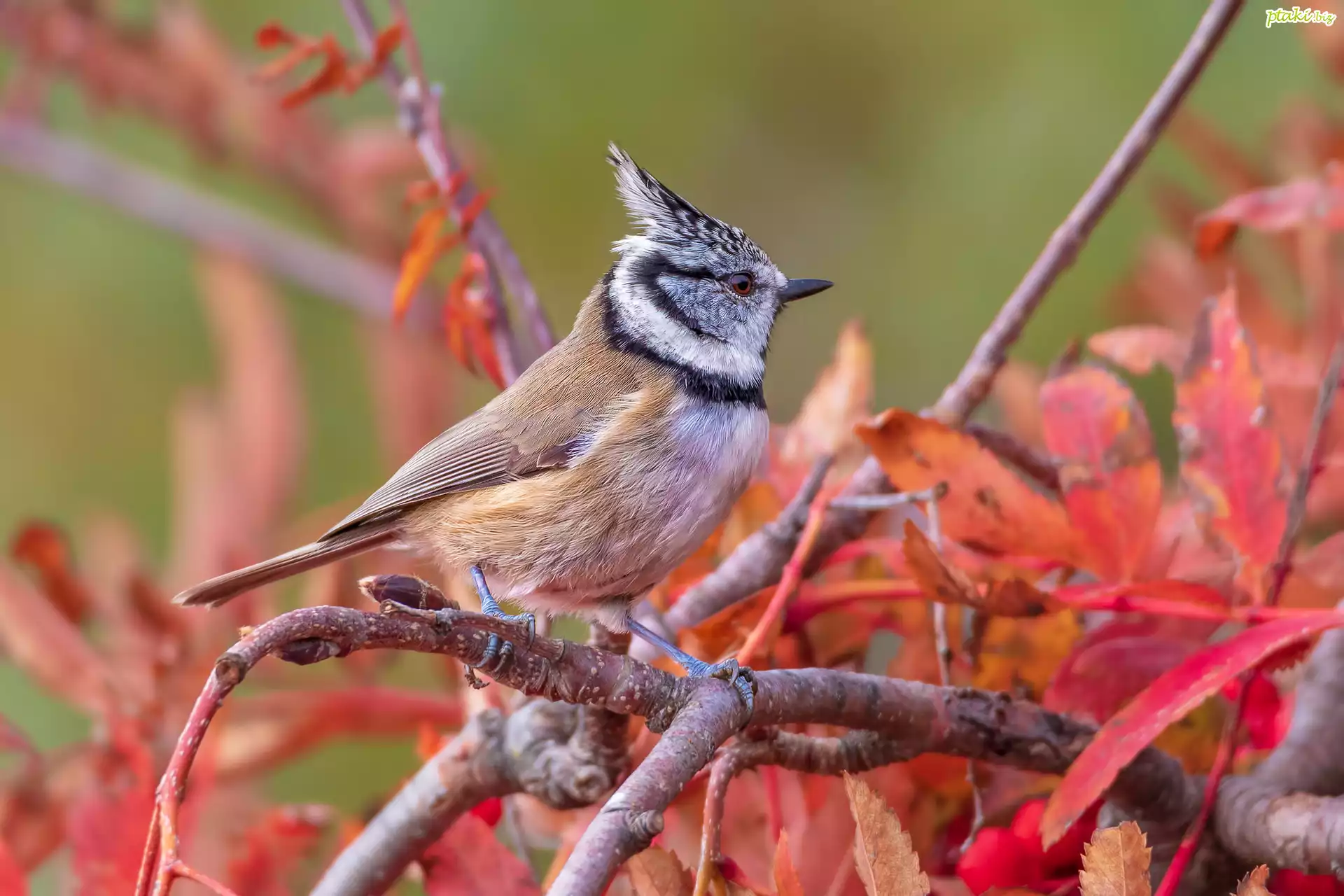Ptak, Sikora, Czubatka europejska, Gałęzie, Liście