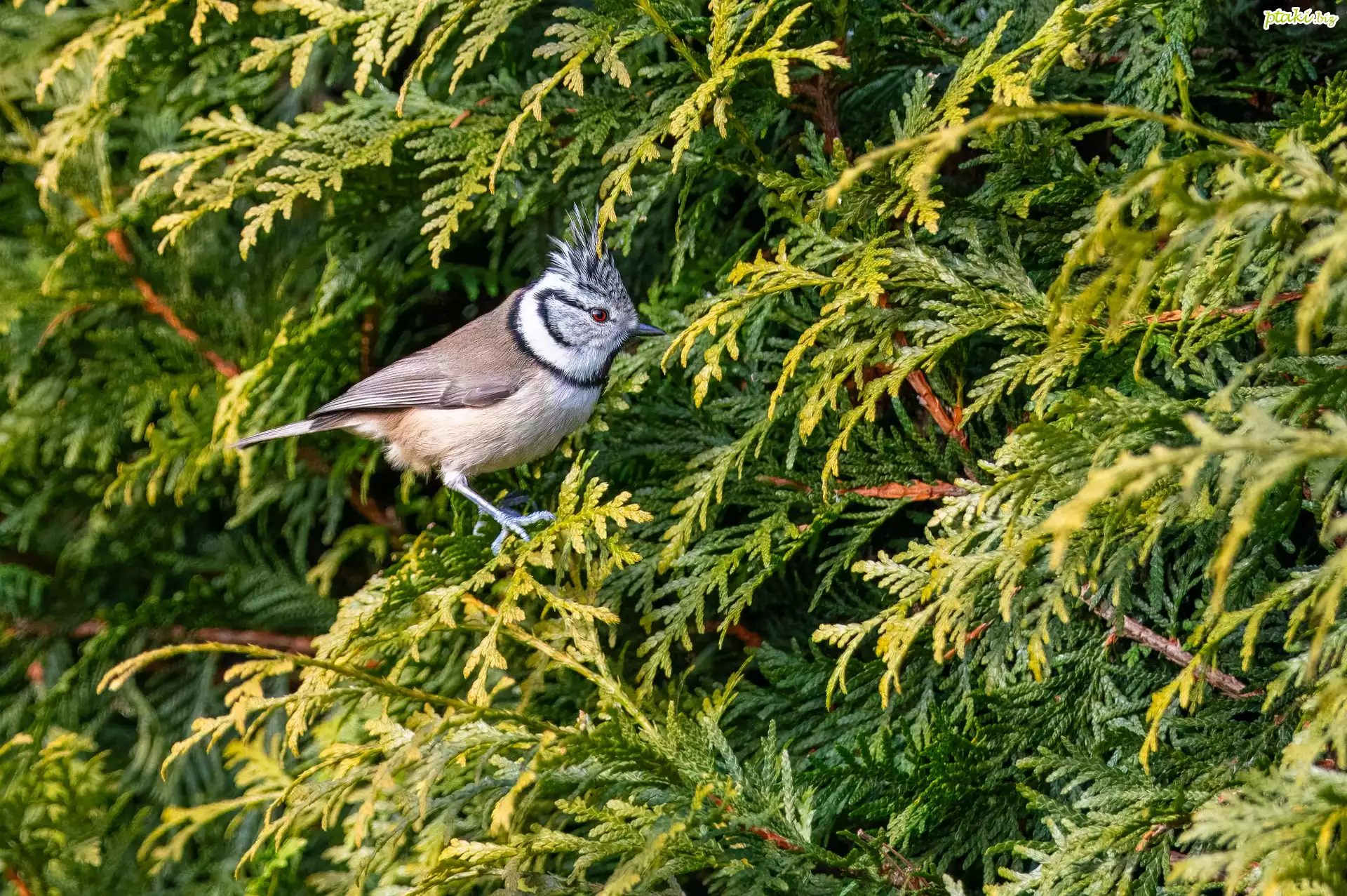 Ptak, Sikora, Czubatka Europejska, Gałązki, Tuja