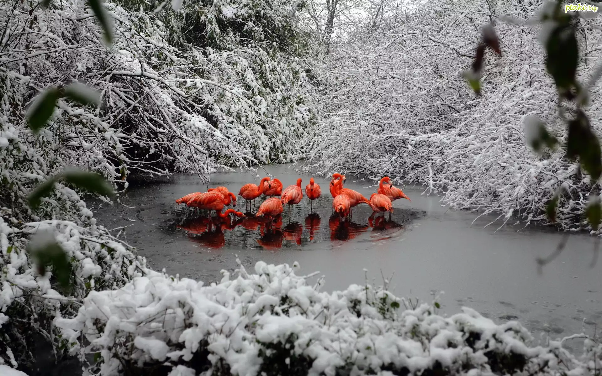 Flamingi, Rzeka, Las, Zima