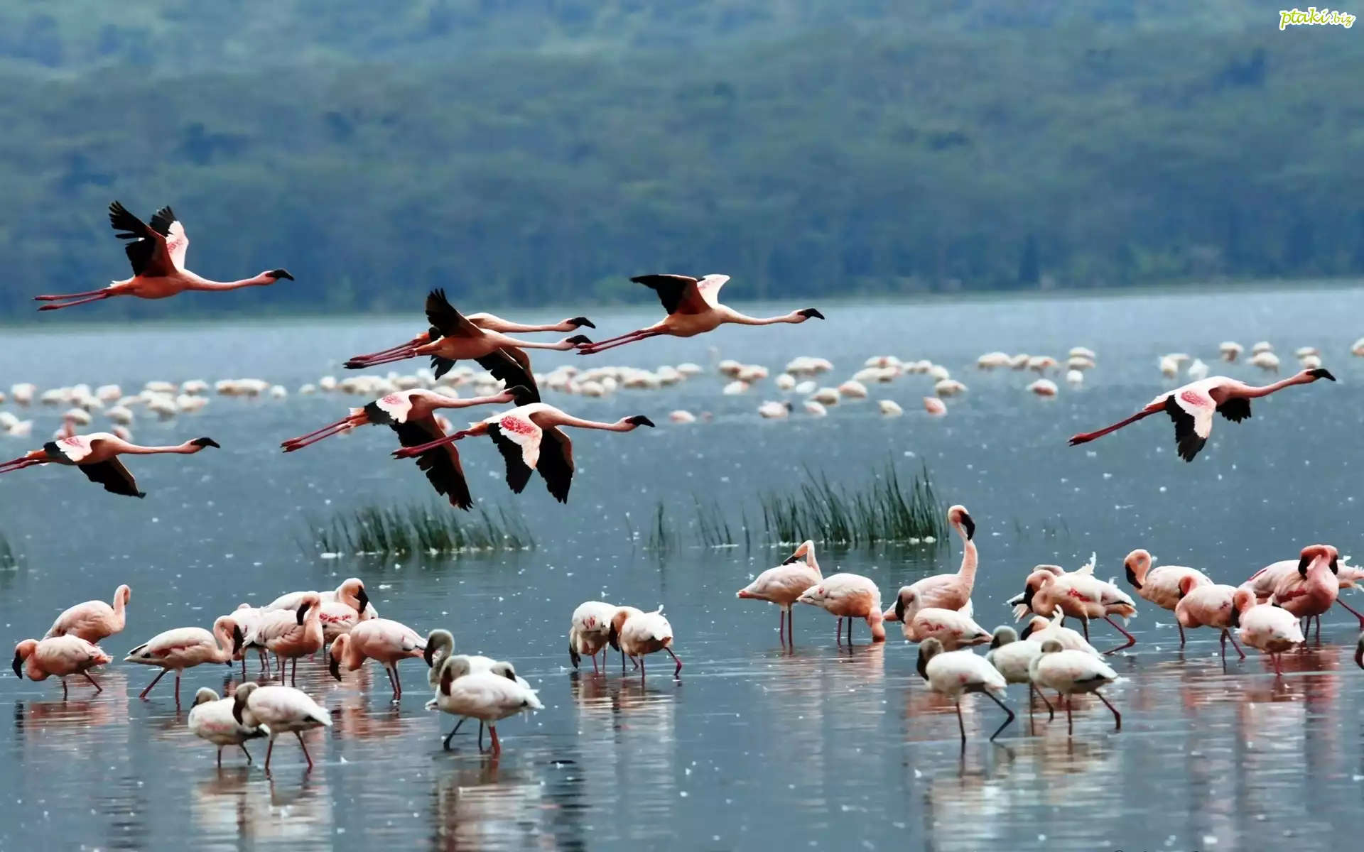 Ptak, Czerwony, Flaming Flaming, Woda, Trawa Flamingi, Woda Flaming, Młode Flaming, Lot Fruwający, Flaming, Morze Pomarańczowe, Flamingi Flamingi Andyjskie Flamingi, Pisklęta, Tanzania Flamingi, Wygięte, Szyje Flamingi Różowe, Stado, Woda Flamingi, Drzewa, Trawa Trzy, Flamingi, Woda Stado, Flamingi