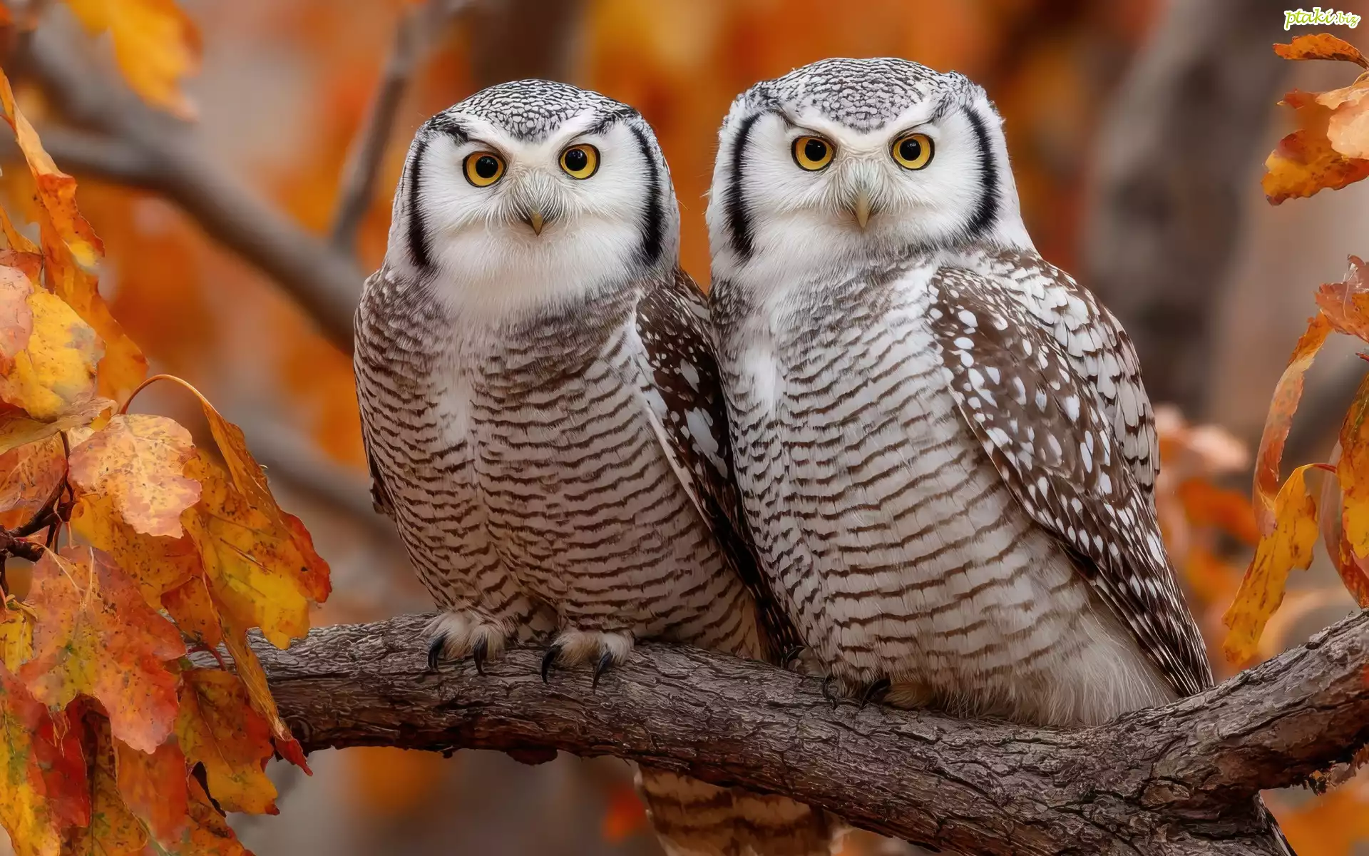 Liście, Dwie, Sowy, Gałąź, Grafika AI