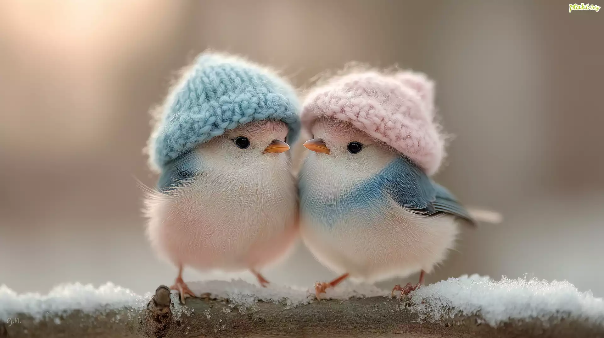 Dwa, Ptaki, Czapki, Gałąź, Śnieg, Grafika AI
