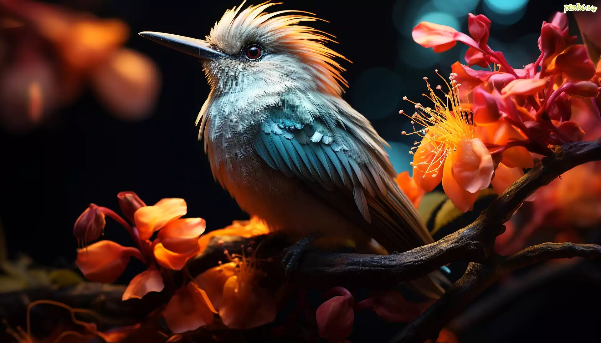 Ptak, Gałąź, Kwiatki, Światło, Grafika