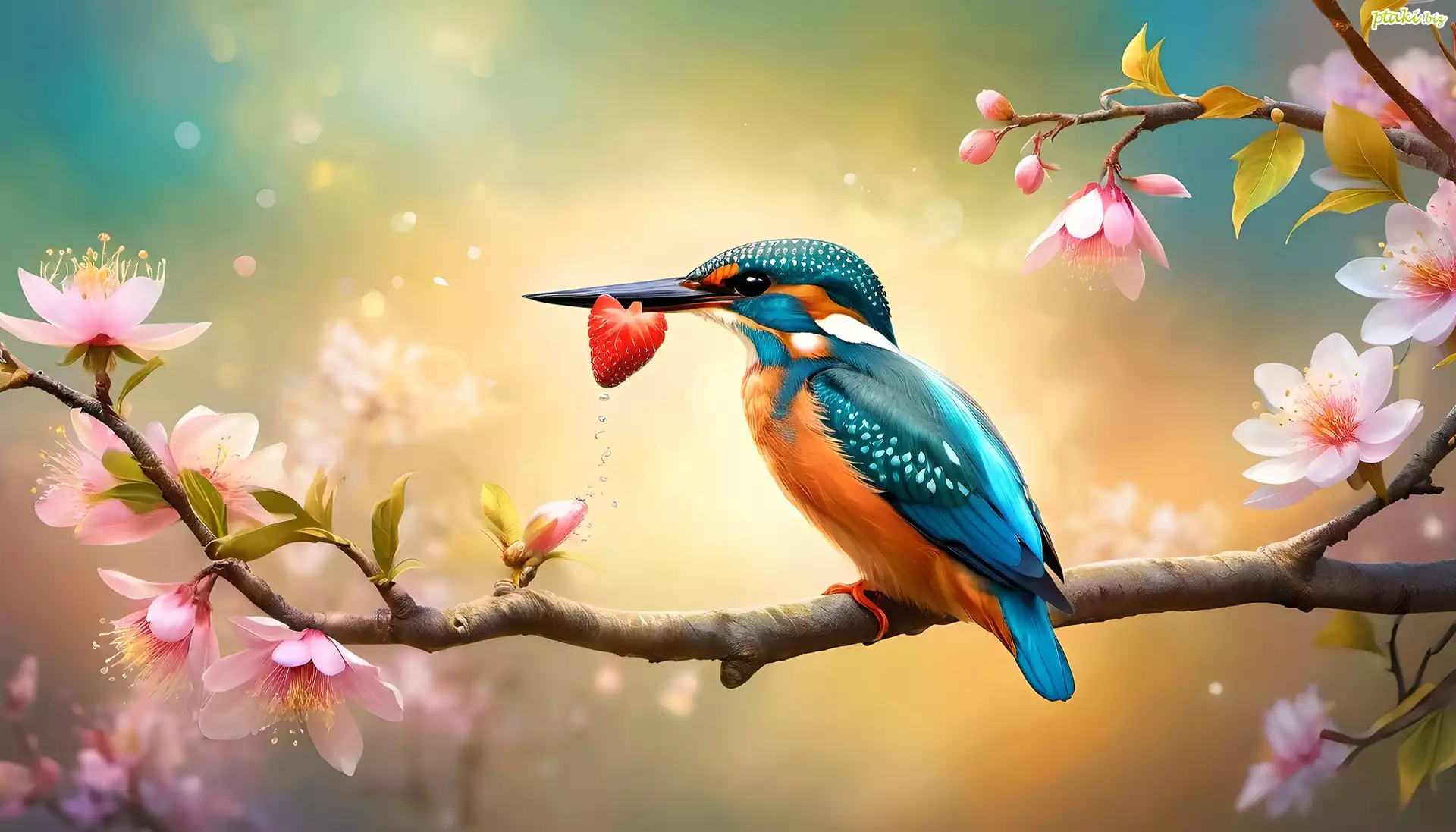 Zimorodek, Gałąź, Różowe, Kwiaty, Grafika