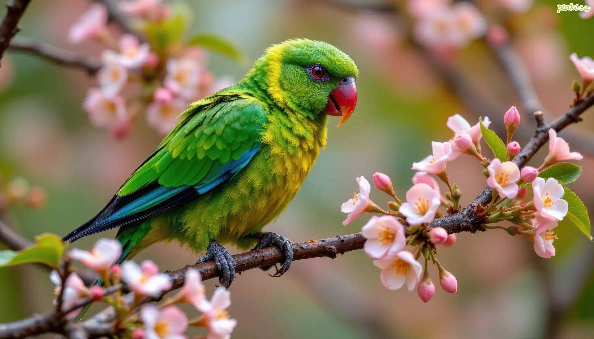 Zielona, Papuga, Kwiaty, Gałązka, Grafika AI