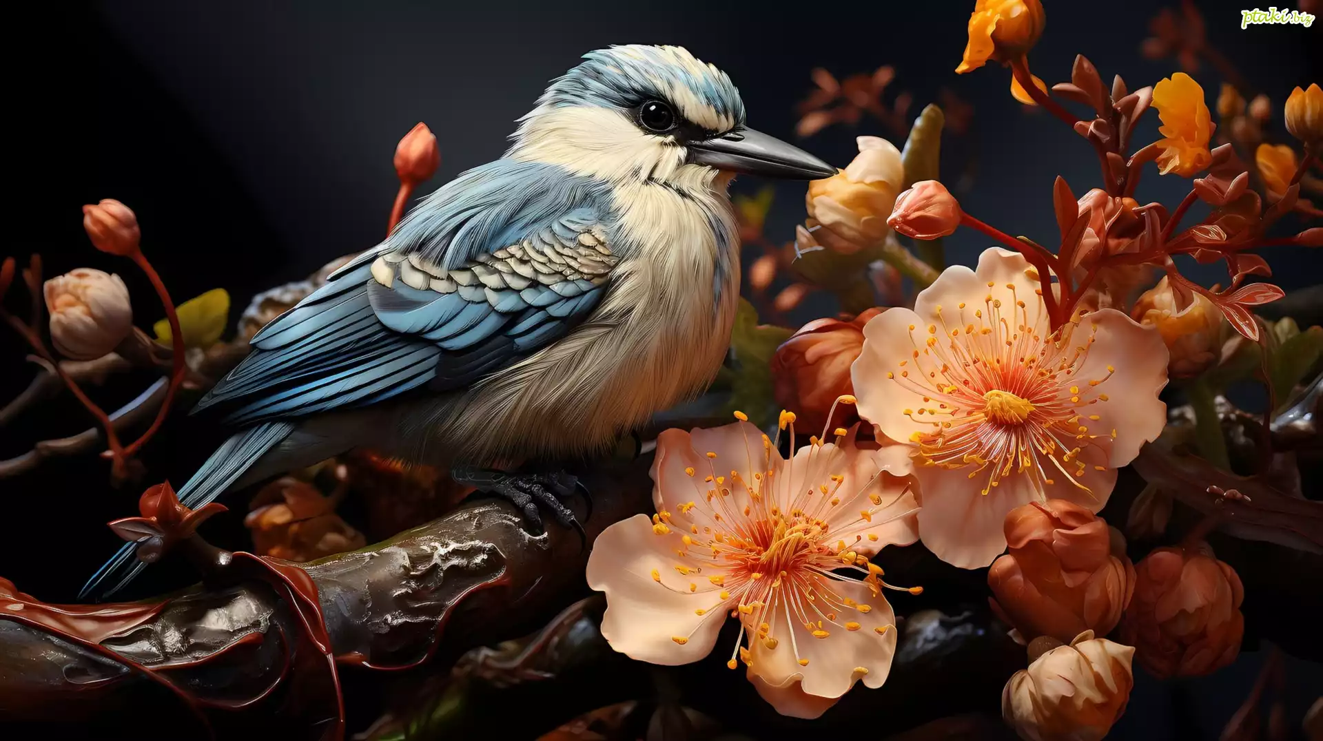 Biało-niebieski, Ptak, Gałązka, Kwitnąca, Grafika