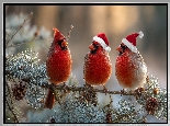 Trzy, Ptaki, Kardynały, Gałązka, Sosna, Grafika AI