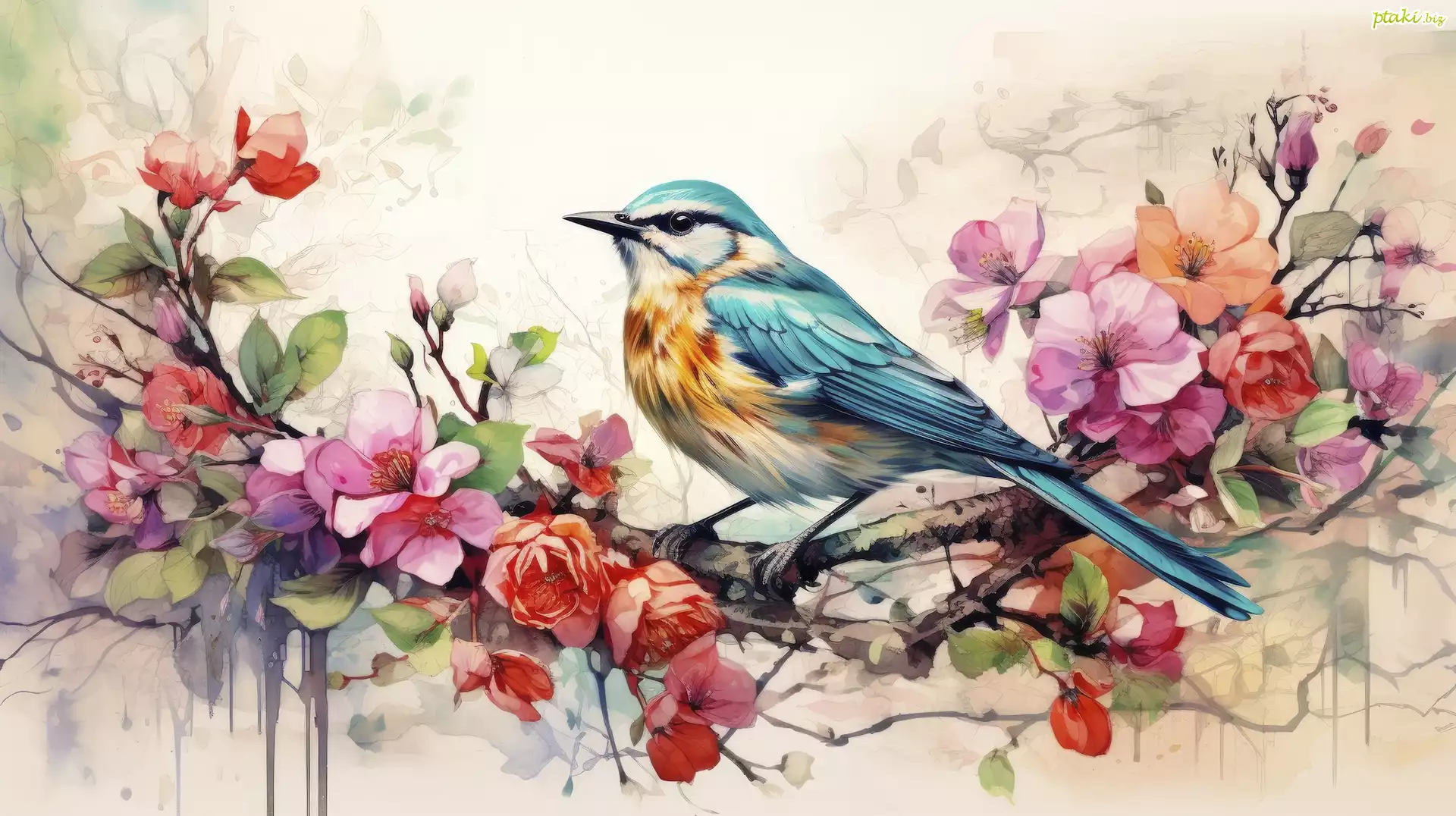 Grafika, Kolorowy, Ptak, Gałązka, Kwiaty, Kolorowe