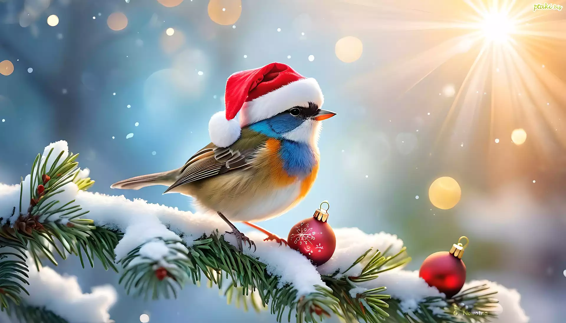 Ptak, Czapka, Mikołaja, Gałązka, Bombki, Śnieg, Grafika