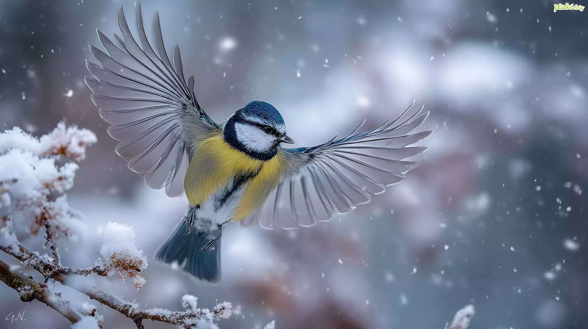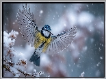 Sikora modraszka, Skrzydła, Gałązka, Zima, Grafika AI