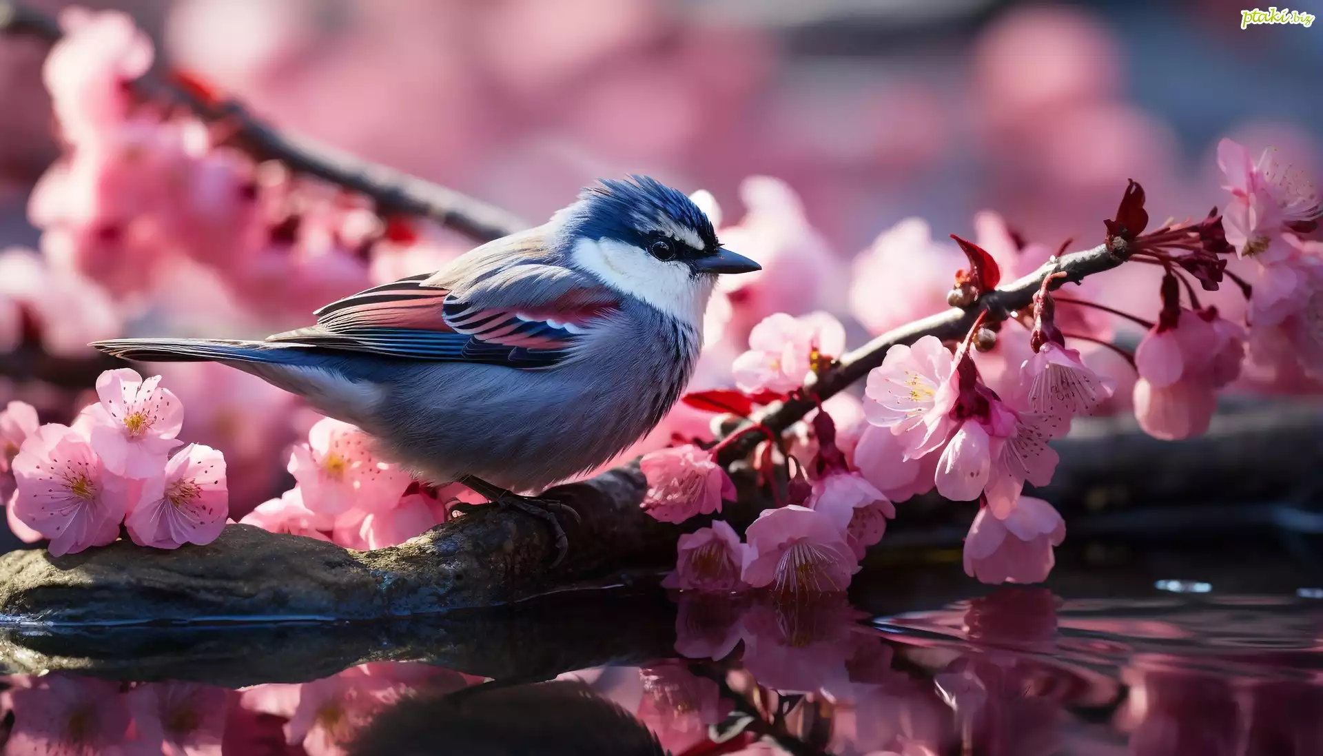 Ptak, Gałązki, Różowe, Kwiaty, Woda