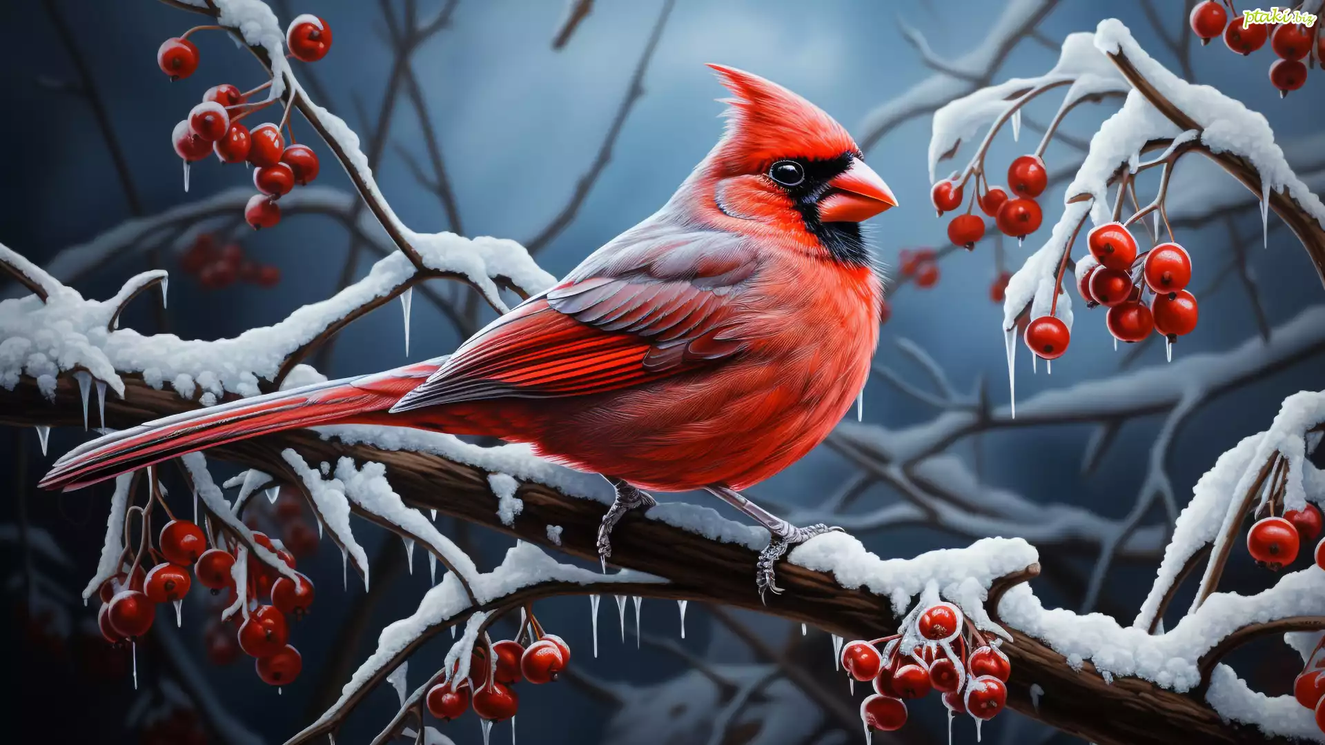 Ptak, Kardynał, Ośnieżone, Gałęzie, Czerwone, Owoce, 2D