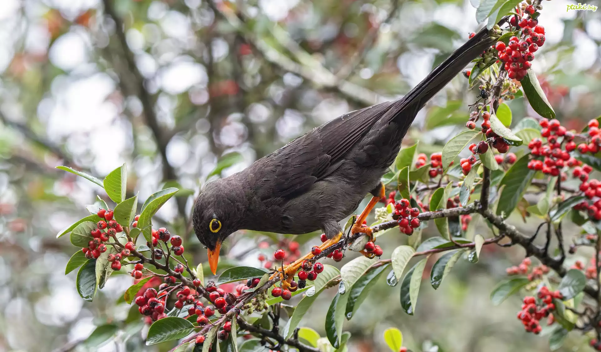 Ptak, Drozd duży, Gałęzie, Czerwone, Owoce
