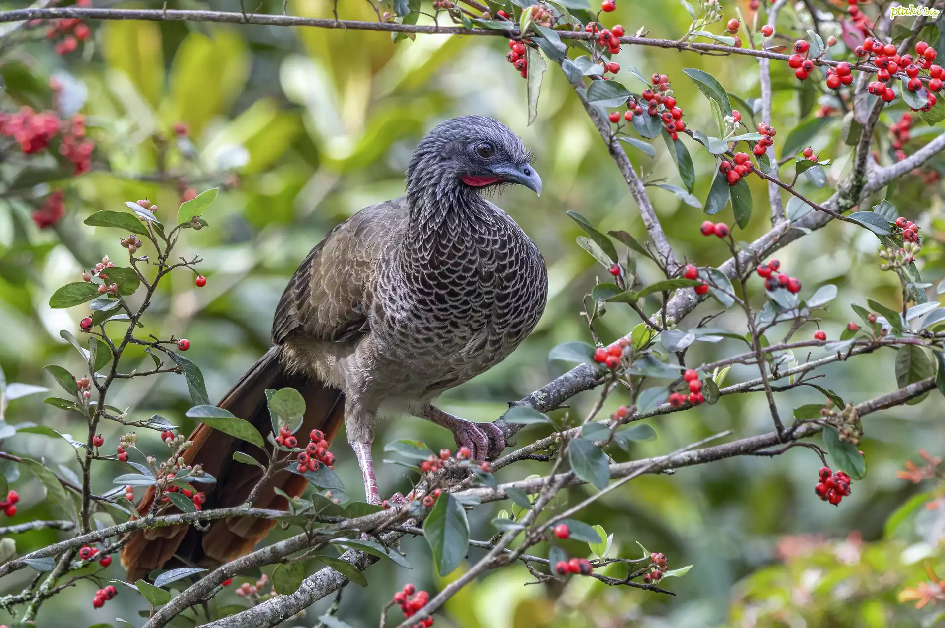 Czakalaka kolumbijski, Ptak, Gałęzie, Czerwone, Owoce